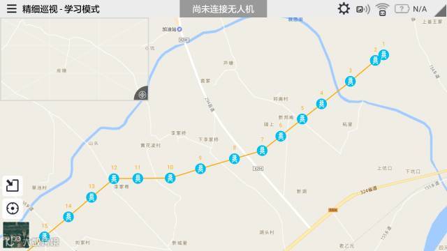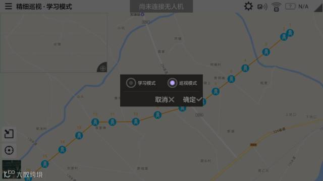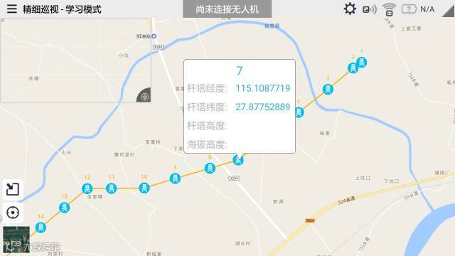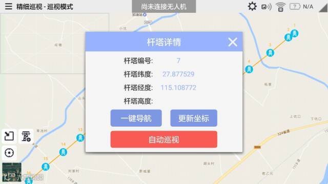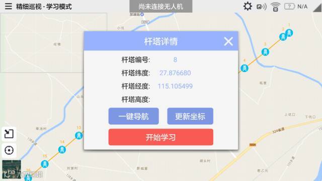 和学习模式类似,可以点击一键导航,使无人机自动飞到杆塔上空,或者通过手动控制无人机飞到杆塔上空之后,进行自动化巡视。