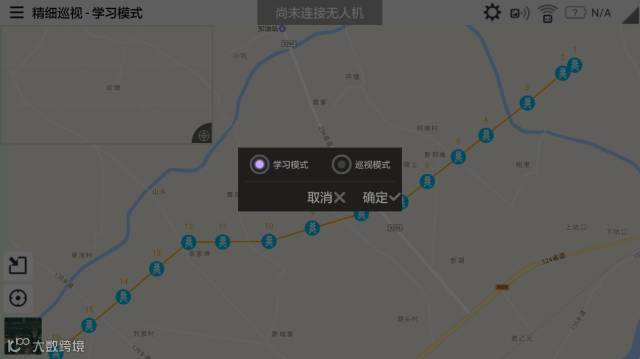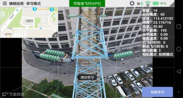 点击一键导航,可以使无人机自动飞到选择的杆塔上空,或者直接点击开始学习按钮,手动控制无人机到杆塔上空,若一键导航的结果和实际杆塔的坐标不一致,则在手动控制无人机到杆塔上空后,点击更新坐标按钮,便可将杆塔的坐标更新为当前无人机的二维坐标。在点击一键导航之后,点击开始学习,系统便开始记录无人机的飞行路径和拍照位置,如下图所示,学习完成之后,点击右下角的结束学习,就完成本次的学习任务。