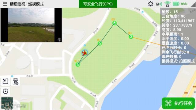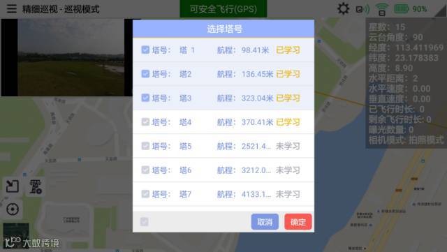 对已经学习过的杆塔进行多选,之后点击确定,可在地图上看到右下角出现执行任务按钮,点击执行任务,无人机便开始自动化巡视作业。