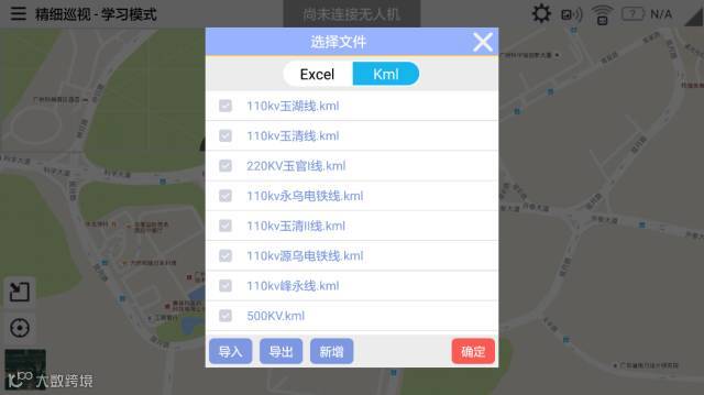 工程应用中,往往根据已有的杆塔的KML文件或者excel坐标文件来界定任务范围,KML文件或者excel坐标文件的导入可通过点击左下角的导入按钮,根据文件类型在局域网内将杆塔坐标导入到手机上。在没有杆塔坐标的情况下,也可以将无人机飞到杆塔上空,之后点击下方的新增按钮,之后点击杆塔图标,在输入杆塔号之后,点击确定,当线路采集完成之后,点击确定按钮,输入线路名称,电压等级以及负责班组,便可完成一条线路的杆塔采集。