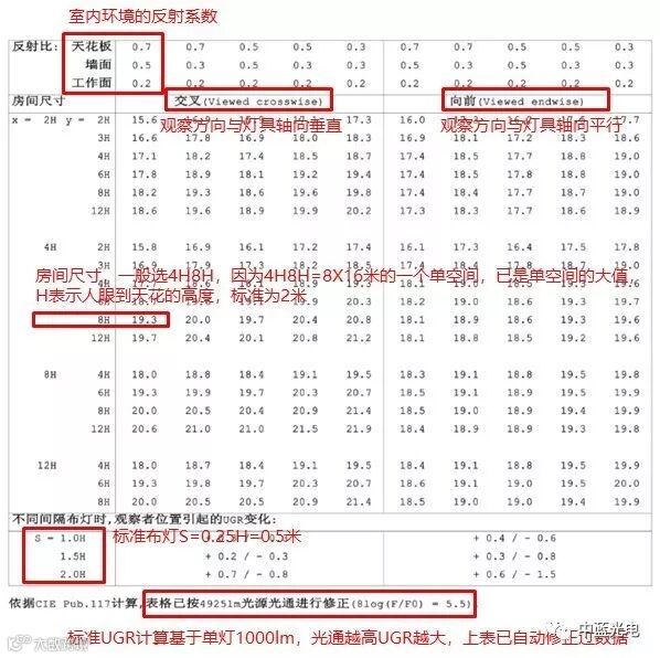 在这个表格(表一)内的数据,是基于人眼到天花板的高度H=2米,灯具排布S=0.25H=0.5米的情况下,定义了5组不同反射率的天花,墙壁,地板的给定空间,其中空间的尺寸长宽信息由X,Y给定,而单一空间的最大尺寸一般不超过4H8H既8X16米,反射率最常用的是第一组既天花板,墙面,地面的反射率分别为0.7,0.5,0.2,所以我们说一个灯具的UGR值是多少一般简单的读取4H8H交叉和向前的第一个数据,取大值,表二里取19.3来作为比较的依据。当实际装灯距离改变时,灯具的排布由于发生变化,不同的观测位置可能导致UGR值变化,在表格里面给出了可能变化的一个范围值。在表的最下方,是依据CIE117根据灯具实际的光通量对UGR进行修正,标准的UGR是按单灯1000lm来定义的,当灯具光通量越大时,UGR值越高。如果最下方的文字出现表格已按XXX lm光通进行修正,则表明上表数据已是根据灯具光通量修订过的数据。