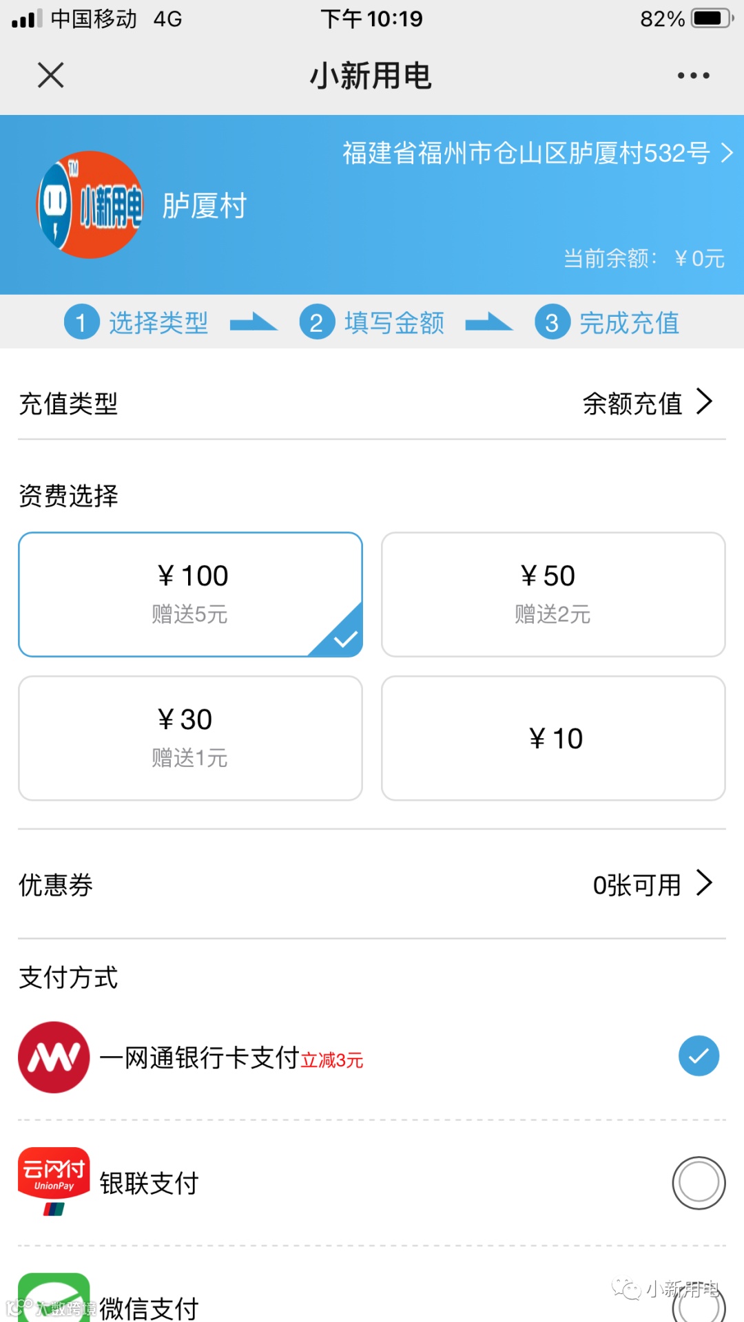 第一步:打开微信公众号【小新用电】,选择菜单栏的【优惠充值】。选择充值金额,勾选【一网通银行卡支付】。