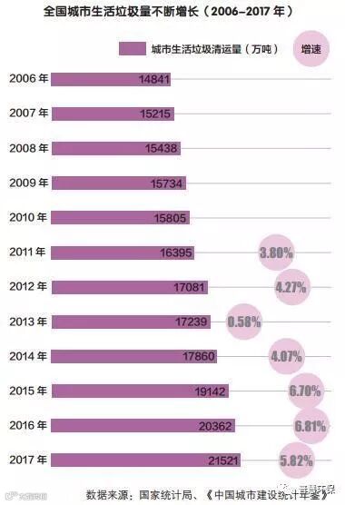 随着城市的快速发展和人民生活水平的提高,每年产生的城市生活垃圾越来越多。住建部2018年发布的《中国城市建设统计年鉴》数据显示,2010年以来,我国生活垃圾清运量逐年上升,2016年超过2亿吨,达到2.04亿吨,同比增长6.81%;2017年约达到2.16亿吨,同比增长5.82%;1500多个县城产生近0.7亿吨垃圾;我国生活垃圾产生量在4亿吨以上。