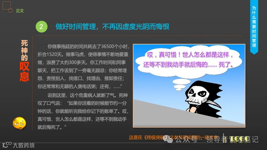 想象一下,生命的最后一刻,死神站在你面前,问你是否后悔未曾好好利用时间。你是否会想起那些被拖延的工作、被遗忘的梦想、被浪费的闲暇?死神会告诉你,时间的账本,每一刻都在记录,每一秒都不容虚度。