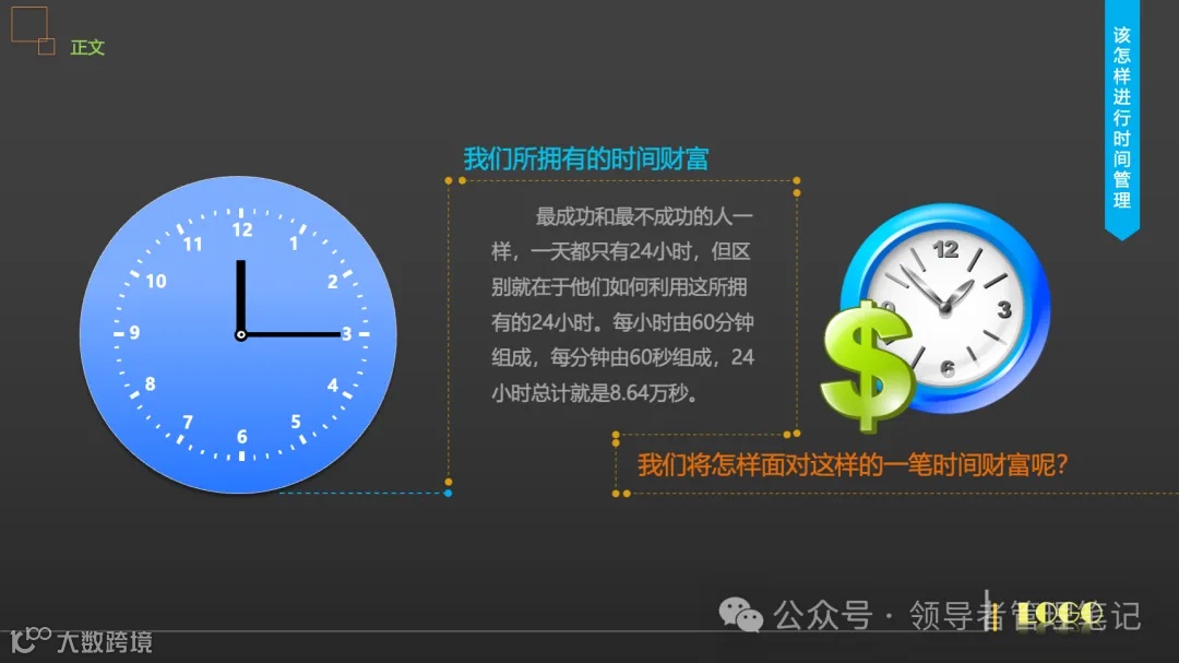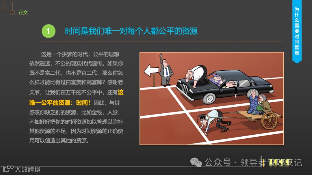 -时间是公平的资源:时间面前,人人平等。无论贫富、地位,每天只有24小时。