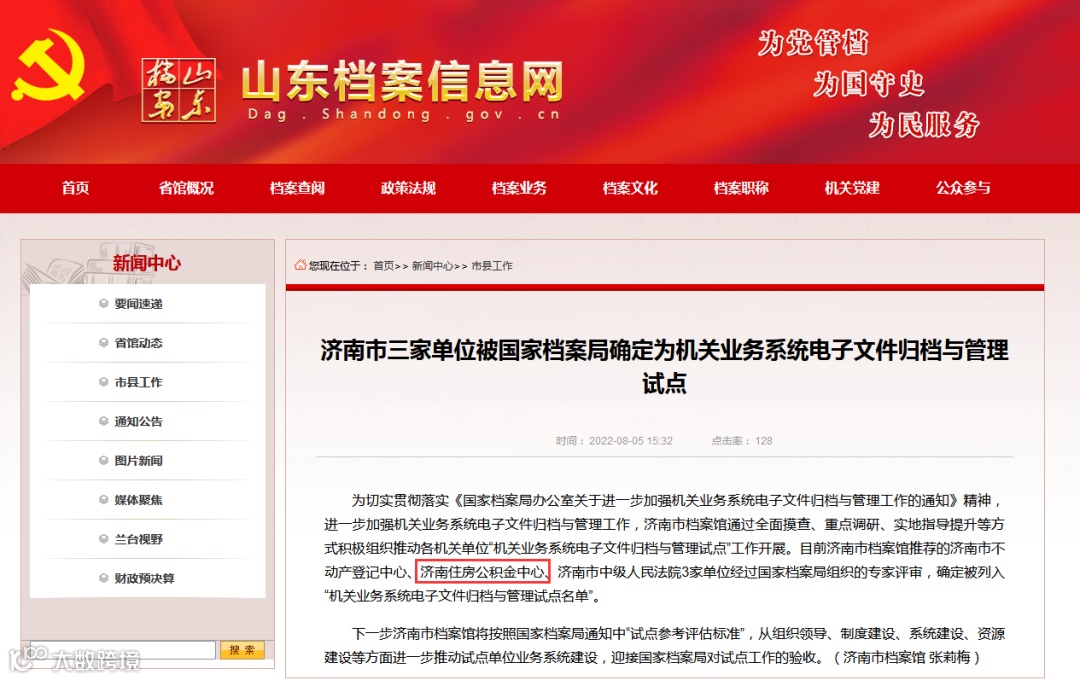 目前济南市档案馆推荐的济南市不动产登记中心、济南住房公积金中心、济南市中级人民法院3家单位经过国家档案局组织的专家评审,确定被列入“机关业务系统电子文件归档与管理试点名单”。