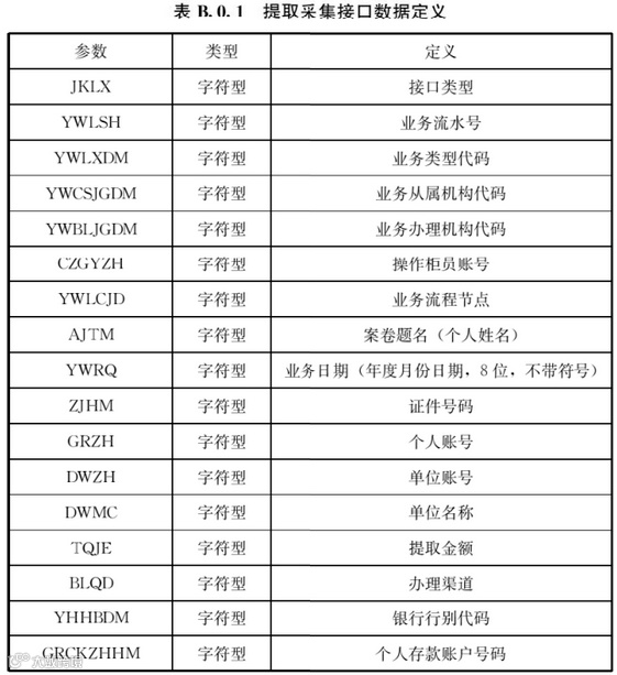 3提取、归集、贷款、楼盘、会计业务数据应符合本标准附录B表B.0.1〜表B.0.5的接口数据定义,查看接口应符合本标准附录B表B.0.6的接口数据定义。
