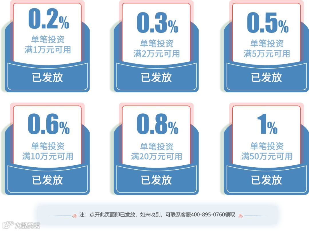 活动期间全民财富平台将对所有投资客户赠送加息券,投资满一定金额,即可使用相应的加息券扩大收益,最高可享1%的加息年化收益。(加息比例及可使用额度参考如下图:)