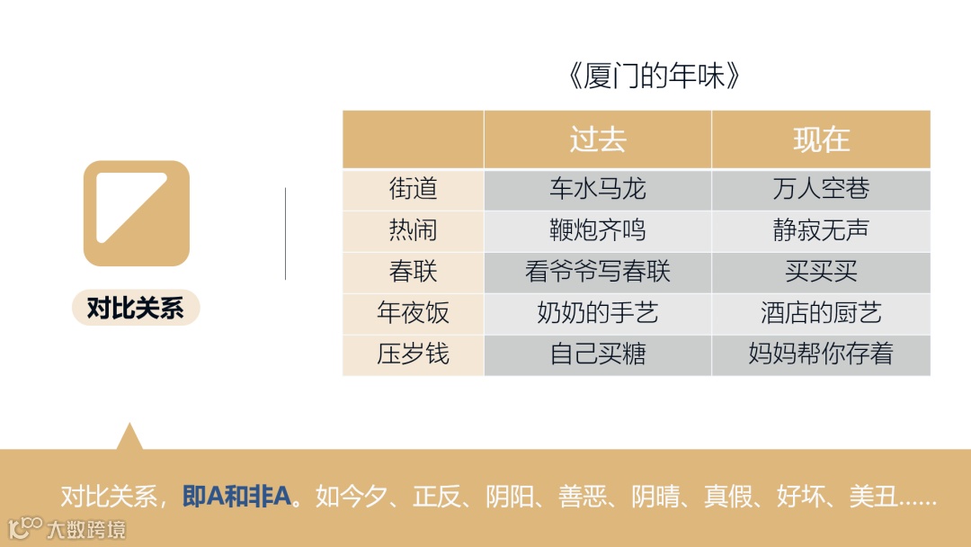 每组中的同类元素(论据、原因、例子)属于同一个上级范畴(论点、结论、现象)。