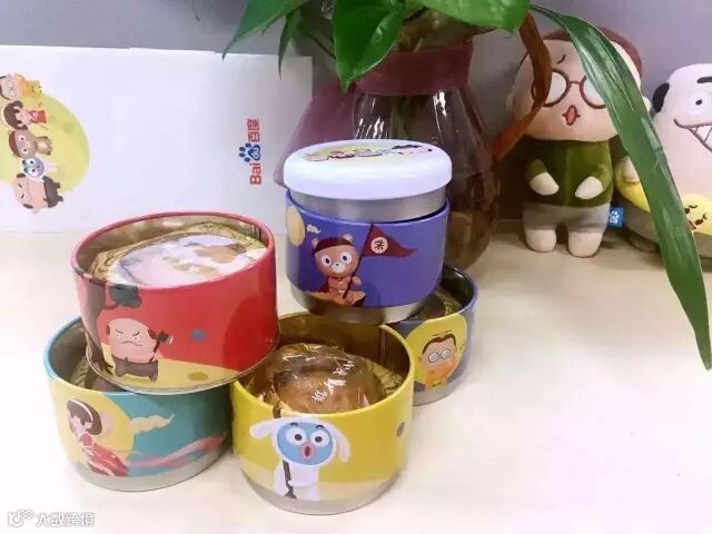 百度的月饼盒采用了卡通形象: 百度熊孩子 ——小度熊、波波、贴贴、王叔、布鲁