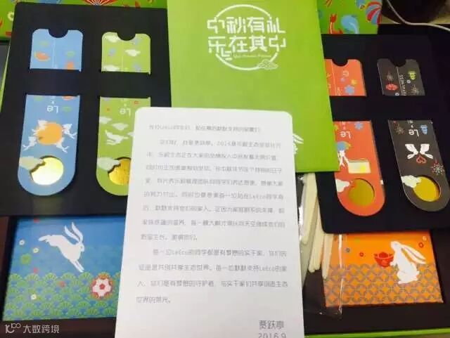 除了月饼还包括一个小礼品袋,里面藏着一张贾跃亭写满真诚寄语的卡片和四张书签