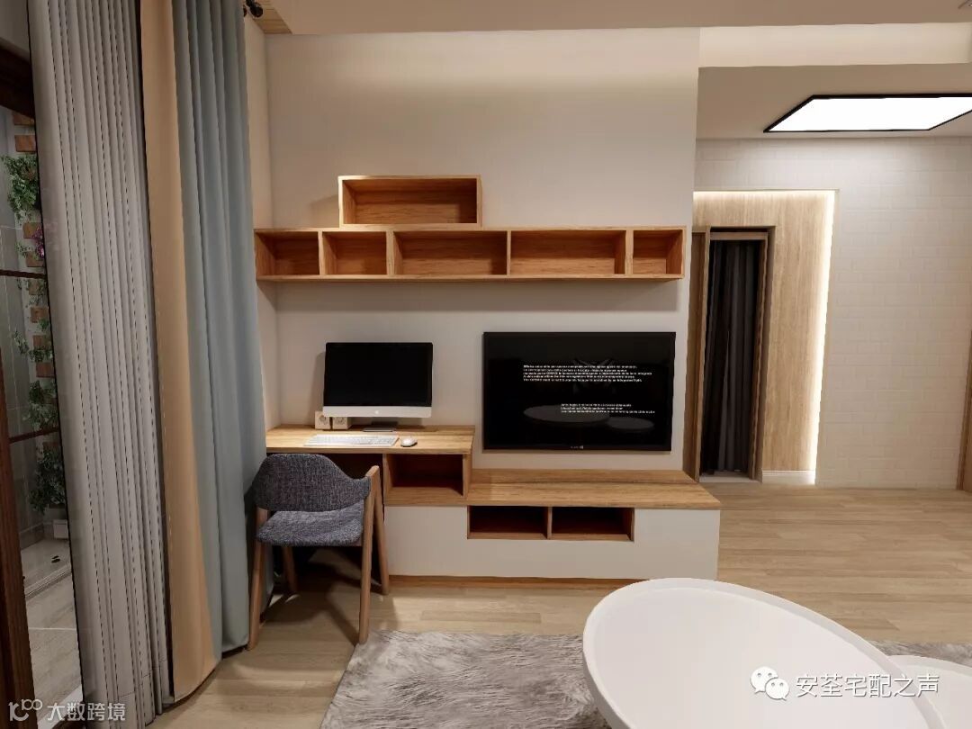 小户型或小房间的电视柜更强调组合灵活性。安荃宅配也充分考虑了这一点并给出了许多设计方案。上图案例中,电脑桌和电视柜的结合,让不到2米的墙面实用性增强,很有年轻感。