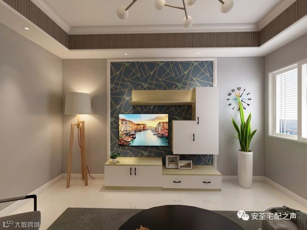 设计感强的方案给人一种轻盈、活泼又富有情趣的氛围,很受客户朋友喜爱。本案例中,注重各元素的创意设计以及巧妙结合。电视背景的不规则图案与独特选色,带出整体设计感;柜台的形状灵活、收纳功能好,在其衬托下,电视无需物理居中却能成为视觉中心;站式台灯简约利落,恰到好处地提亮窗户对面的暗角落,让整体布局对称而不呆板;无底墙钟和绿植巧妙搭配,融入了安荃宅配“个性化定制”和“绿色家居”理念,让人忍不住想一杯奶茶一部剧、一盘水果一家人地坐下来享受休闲时光。
