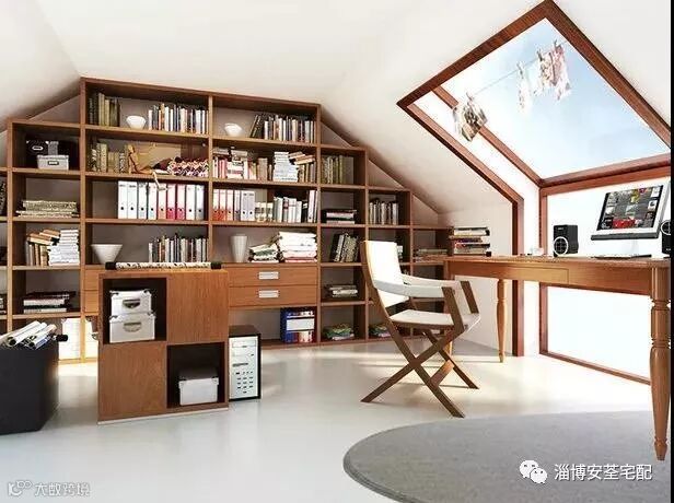 书架、窗户的创意设计,充分发挥了顶楼的不规则空间的优势。顶楼向来是一个安静、采光好的场所,作为书房功能区,再适合不过了。享足自然板材、自然光线和自然空气,抬头望星空、低头闲读书,别有一番趣味呢!