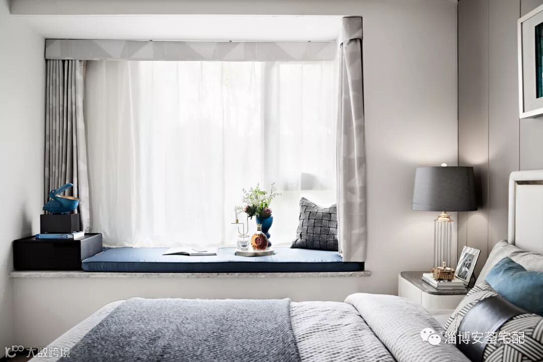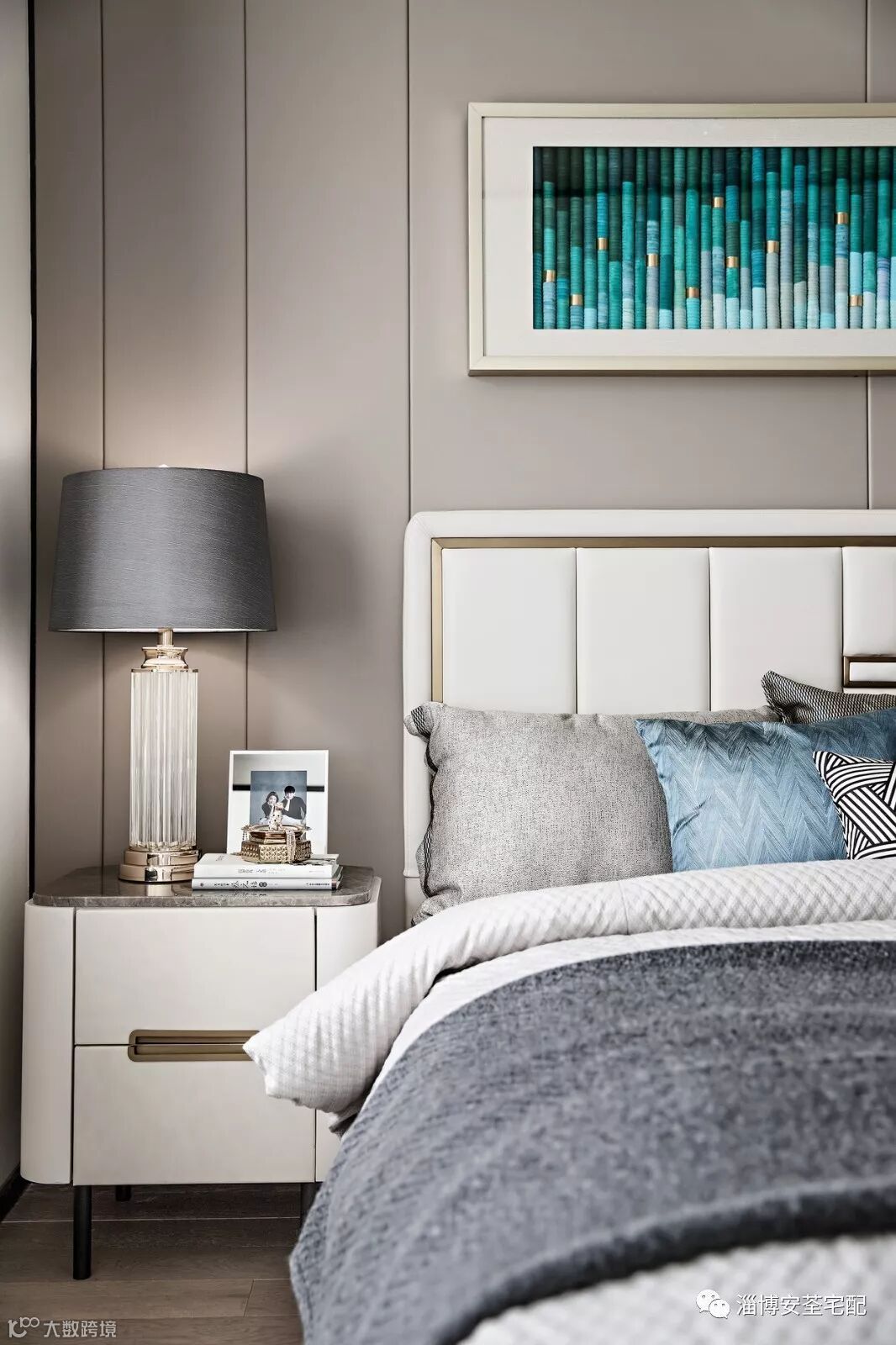棕色背景墙和台灯的设计打造出主卧高端大气的空间调性,给予居住者内心安定的力量。