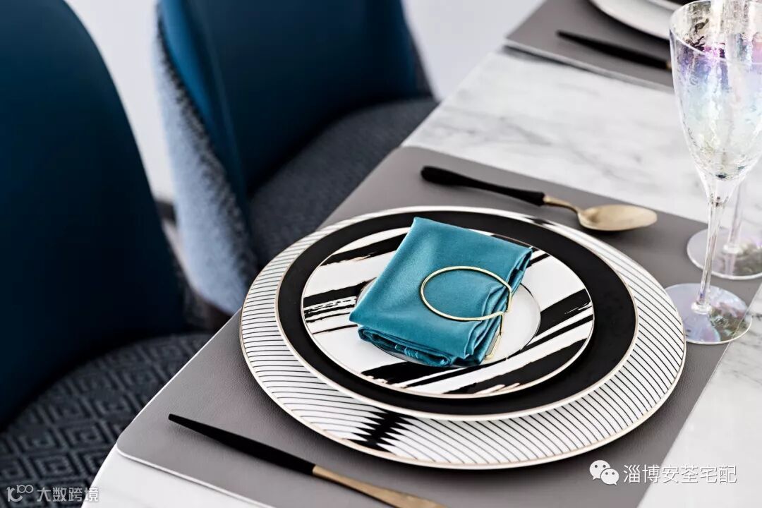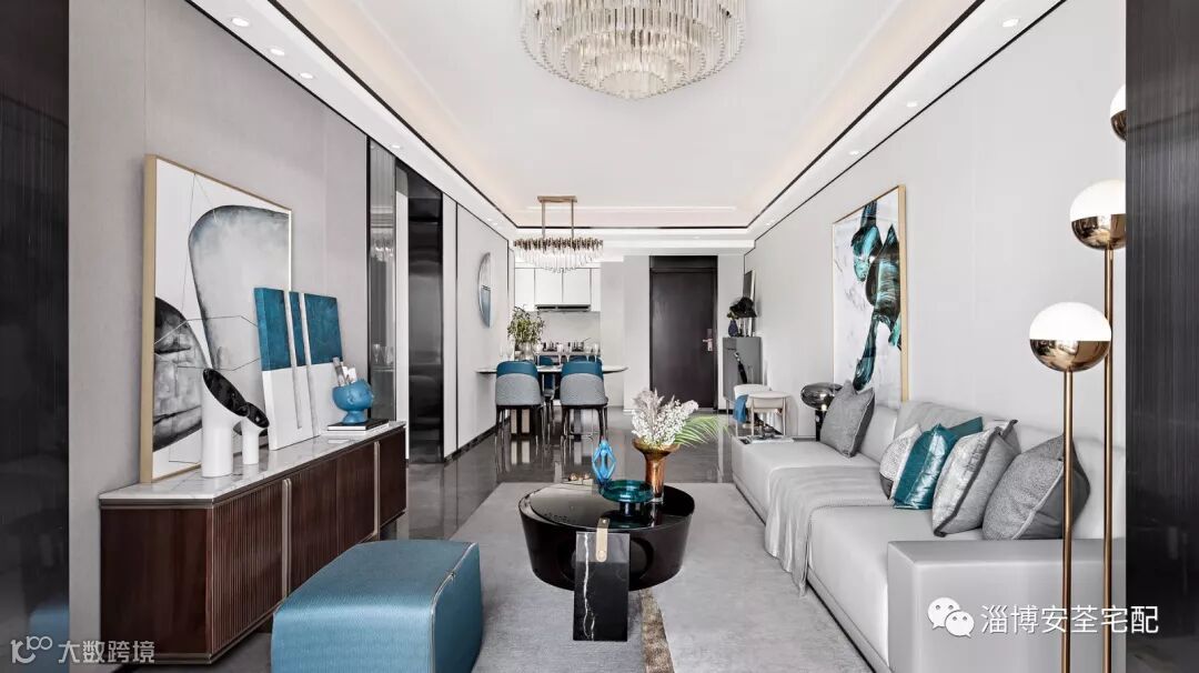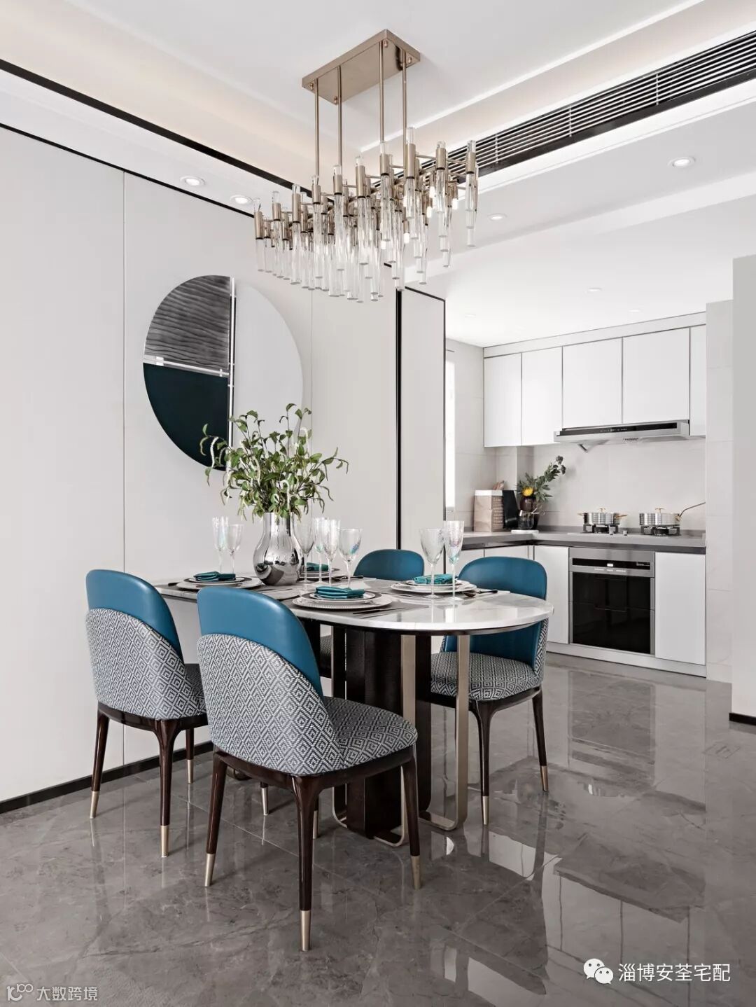 蓝色代表着成熟与睿智,餐厅空间以蓝色为跳色,轻松营造出都市人追求的低调华丽氛围。