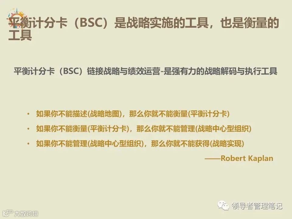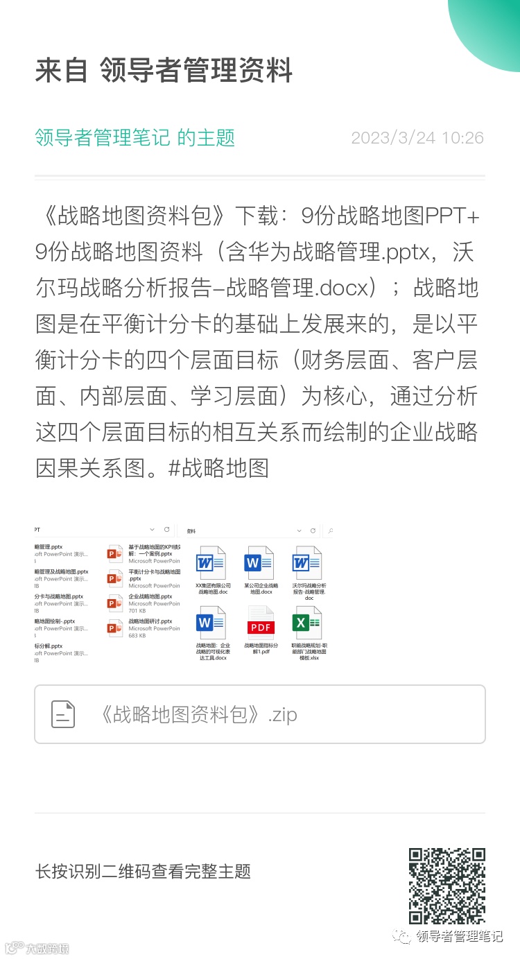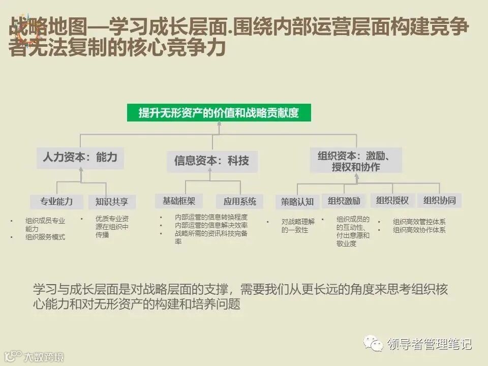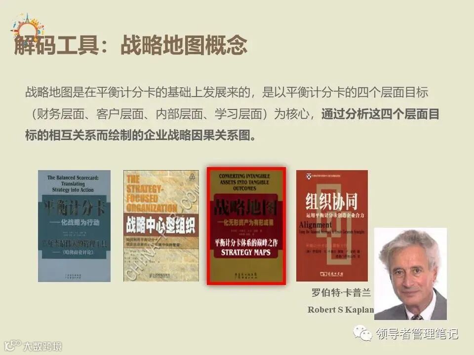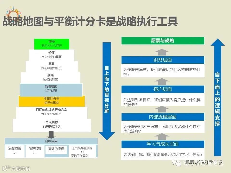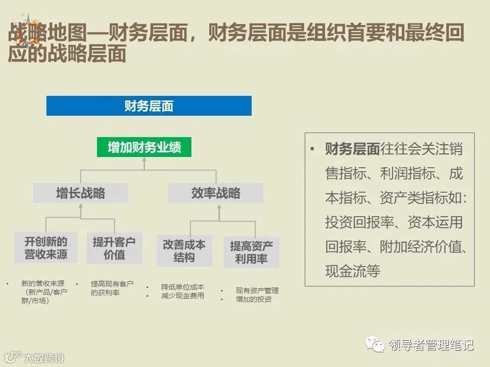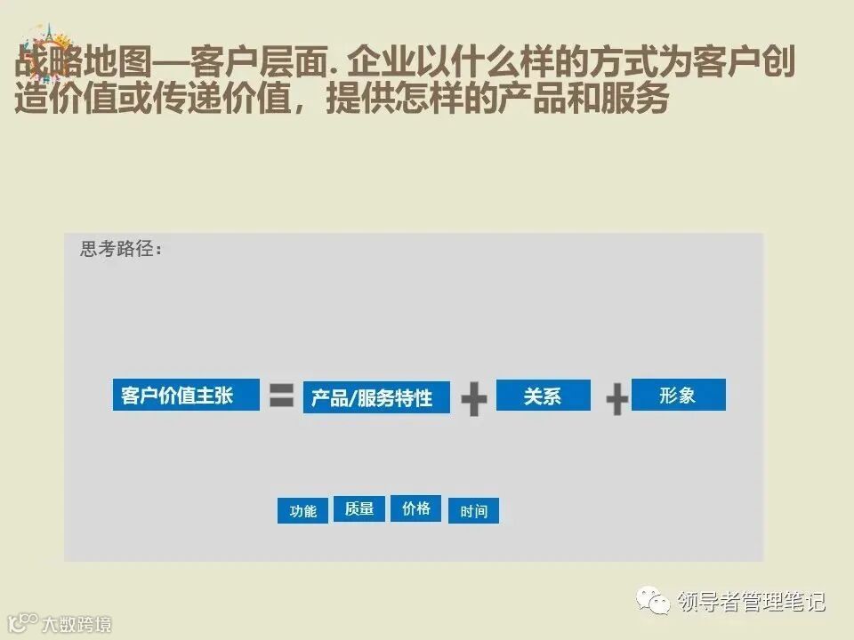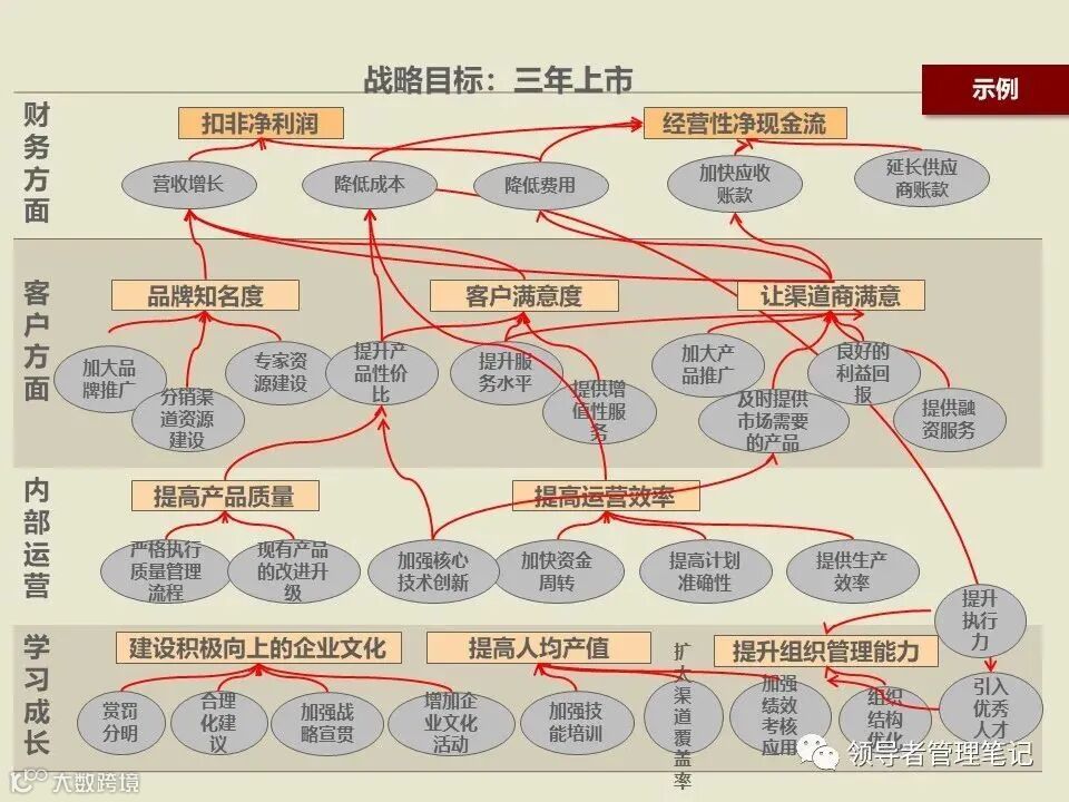 ►领导者说:★战略地图是什么?在企业战略的引导下,从财务、客户、流程、学习成长四个层面定义公司的目标,各个目标之间层层递进。并通过明晰这四个层面目标之间的因果关系来描述企业的战略,这张图就叫做战略地图,让企业以一种更为连贯、完整和系统的方式来审视自己的战略。简单说战略地图是一个工具,是一个描述企业战略的工具。