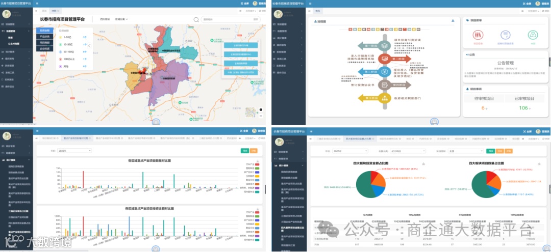 商企通大数据平台提供大数据智慧招商+大模型投资决策一站式解决方案,平台分析研究了300多个产业图谱、上下游产业链,从全国2.1亿户市场主体中精选分析出10万+上市公司(含各国家各省市各行业500强企业)的投资方向和产业布局,累积成一万多个精准有的投资能力和投资意向的投资项目信息的数据库,结合3000所高校和科研院所的2000万+科研成果和专利,联动100多家投资机构和基金公司,为地方政府强链补链招商引智助力。