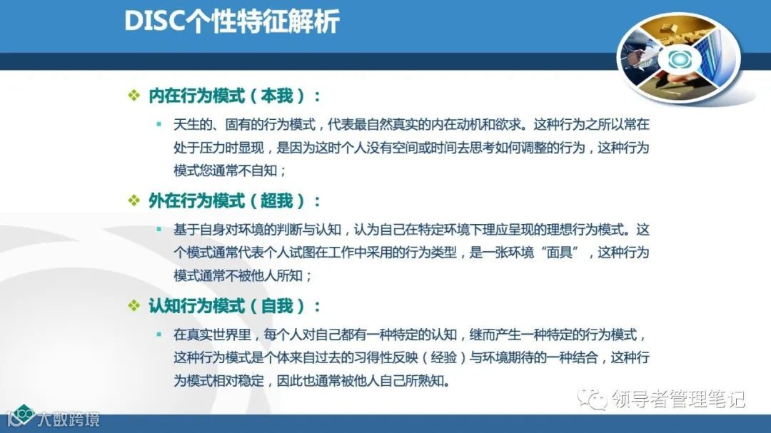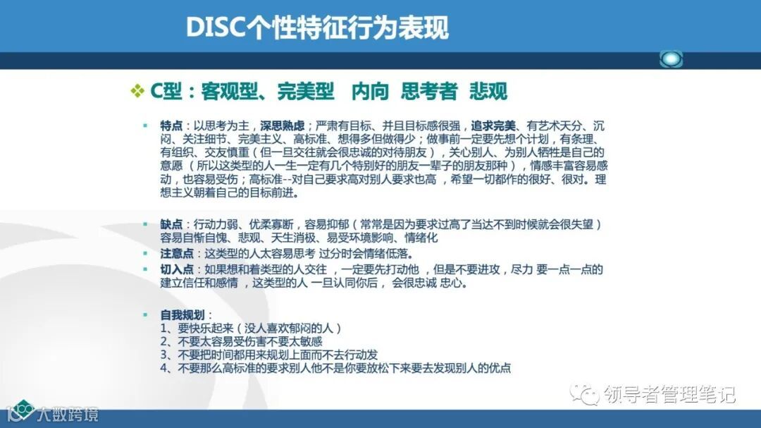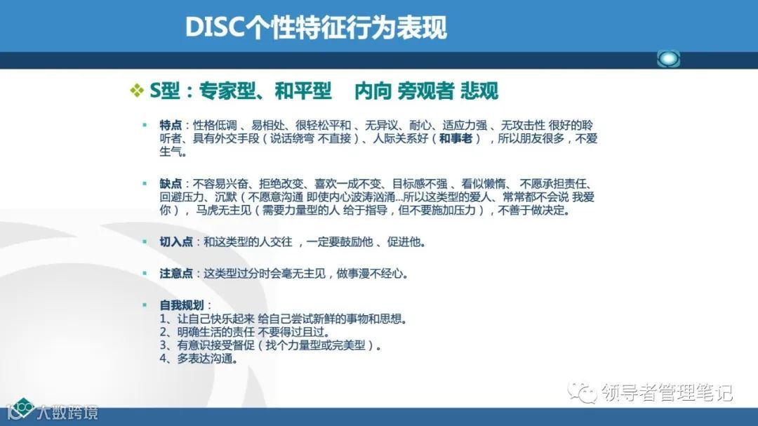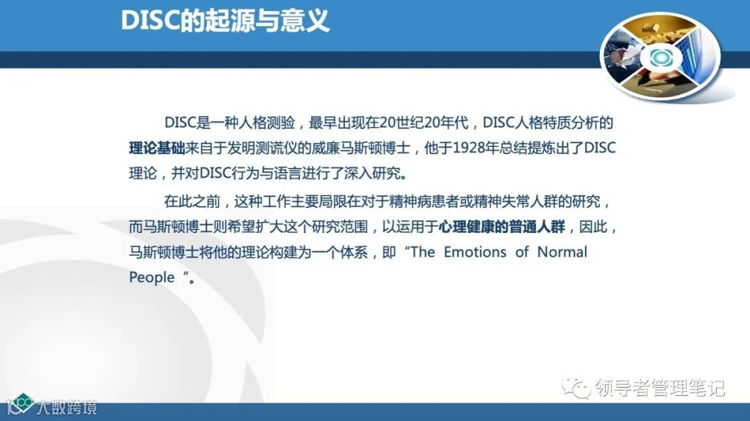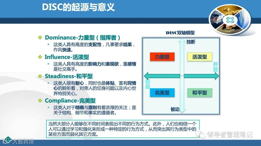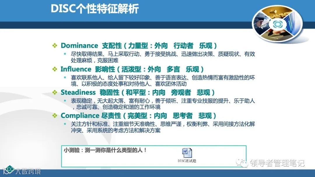 DISC个性测验是国外企业广泛应用的一种人格测验,用于测查、评估和帮助人们改善其行为方式、人际关系、工作绩效、团队合作、领导风格等。77页PPT解透《DISC性格分析(培训用)》课件.pptx下载见文内二维码。