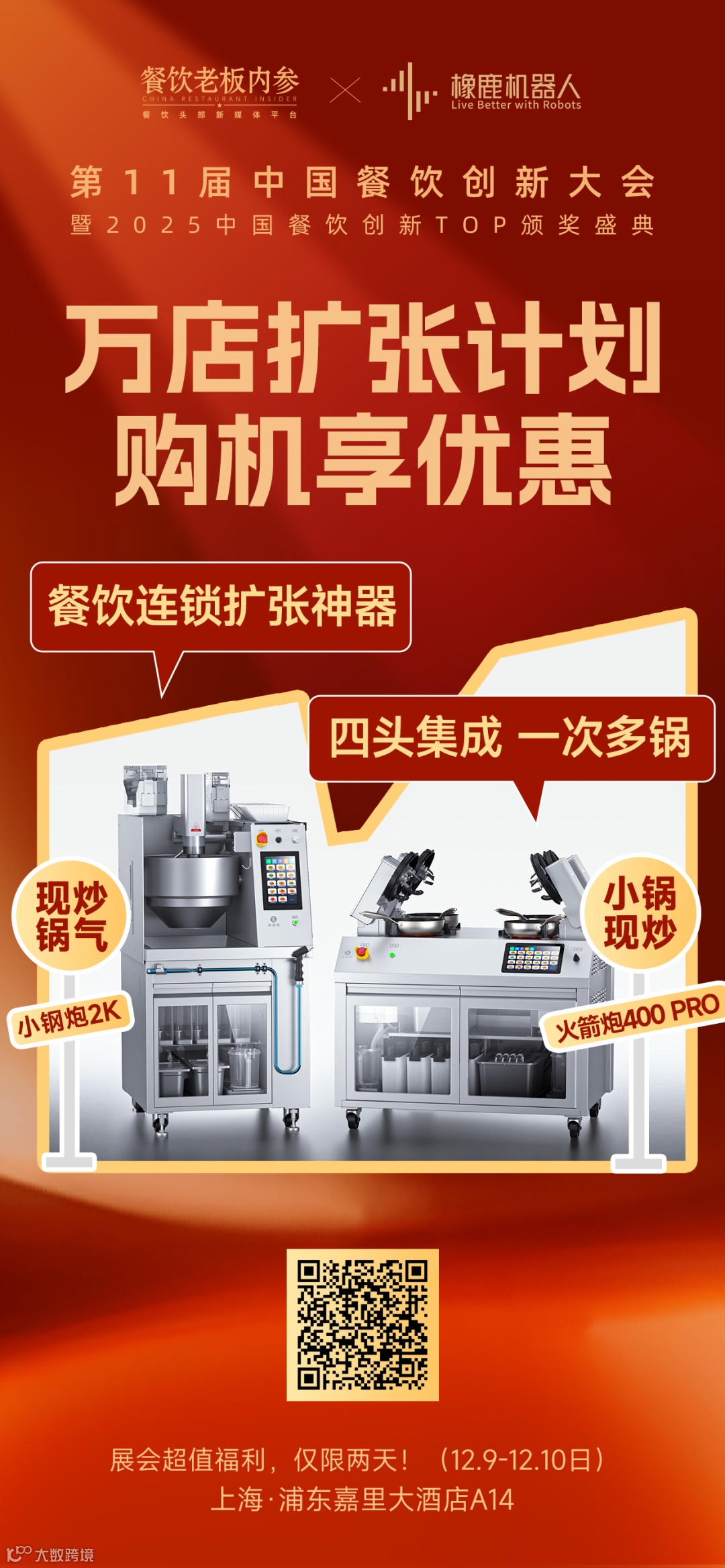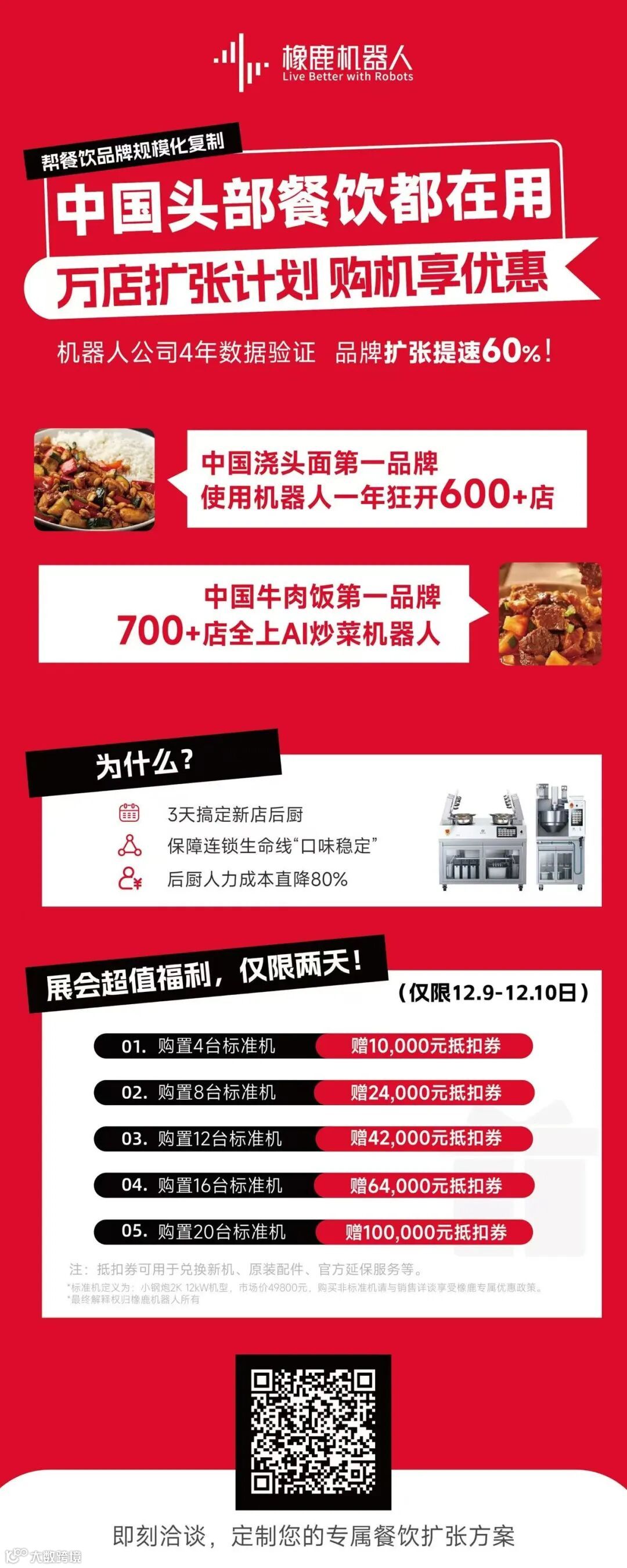 展会现场,橡鹿机器人将正式开启“万店扩张计划”,购机享优惠!诚邀各位连锁餐饮伙伴莅临A14展位,现场洽谈合作,或扫描下方二维码预约体验,锁定限时专属福利。
