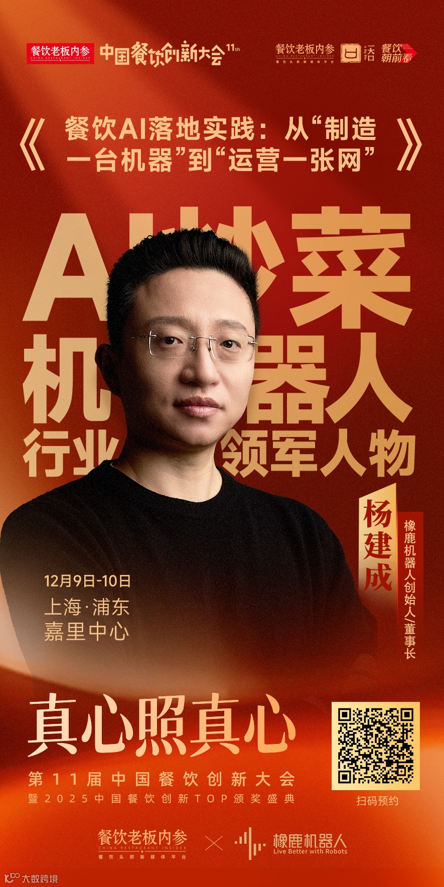 橡鹿机器人创始人、董事长杨建成受邀参会,并将以《餐饮AI落地实践:从“制造一台机器”到“运营一张网”》为题发表年度演讲,直面餐饮规模化背后的供应链、流程与数据的系统性困境,分享橡鹿机器人多年实践,从攻克“锅气”数字化的单点技术,跃迁到构建一张连接运营、供应链、菜谱与生态的“效率网络”。
