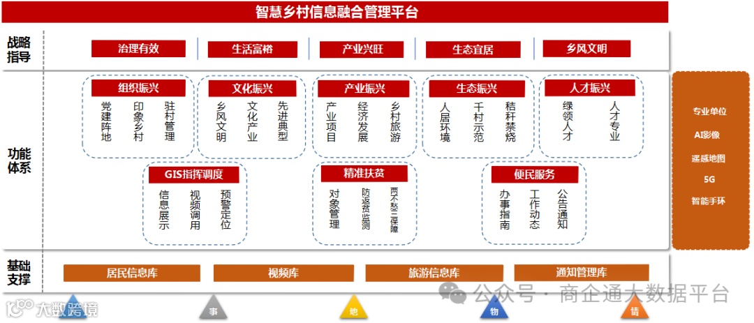 统筹人才、产业、资源、文化、服务等数据,推进智慧乡村基础设施、系统平台、应用终端及招商引资建设,实现“一张网”、“一张图”智慧乡村治理现代化建设蓝图,强化五大振兴策略,一站促振兴。