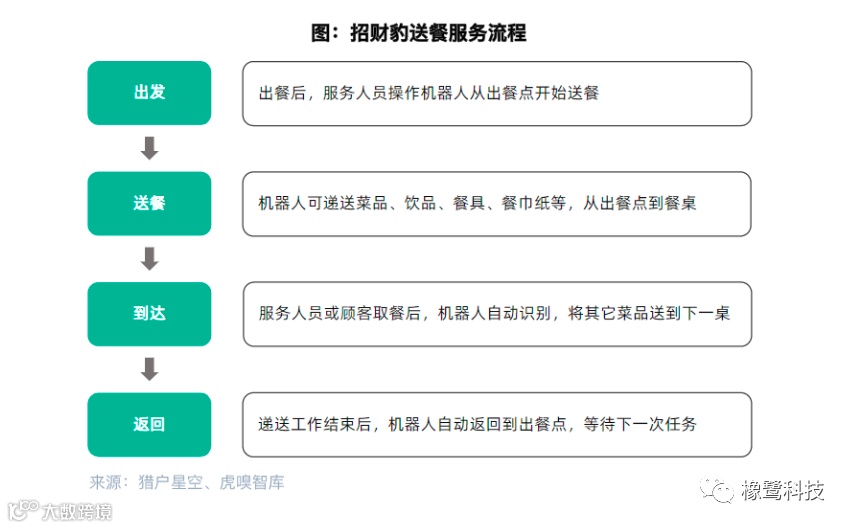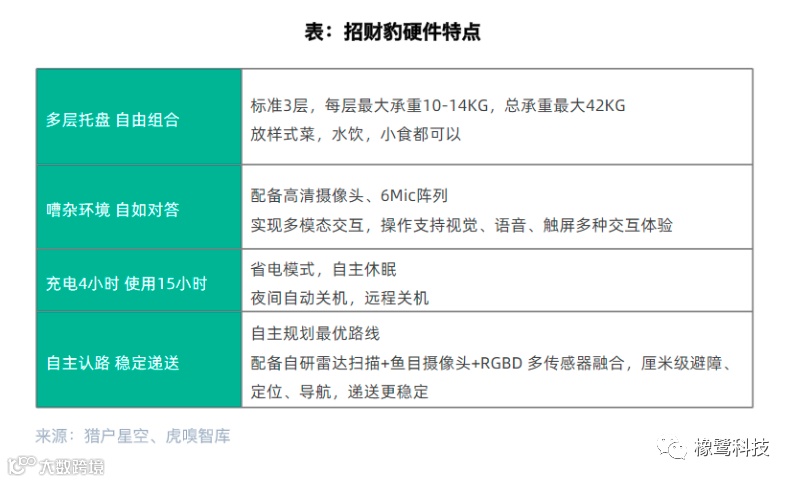 招财豹每日可送餐400-600盘,续航时间达12-15小时,1台机器人工作效率已与2-3名服务员相当。招财豹月租金2000元左右,相当于普通服务员工的1/2左右。
