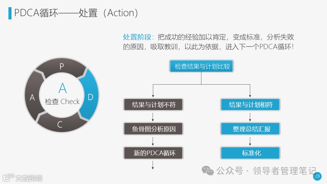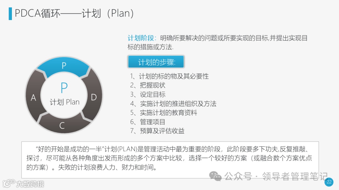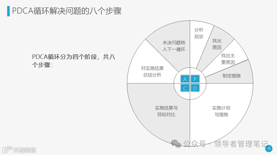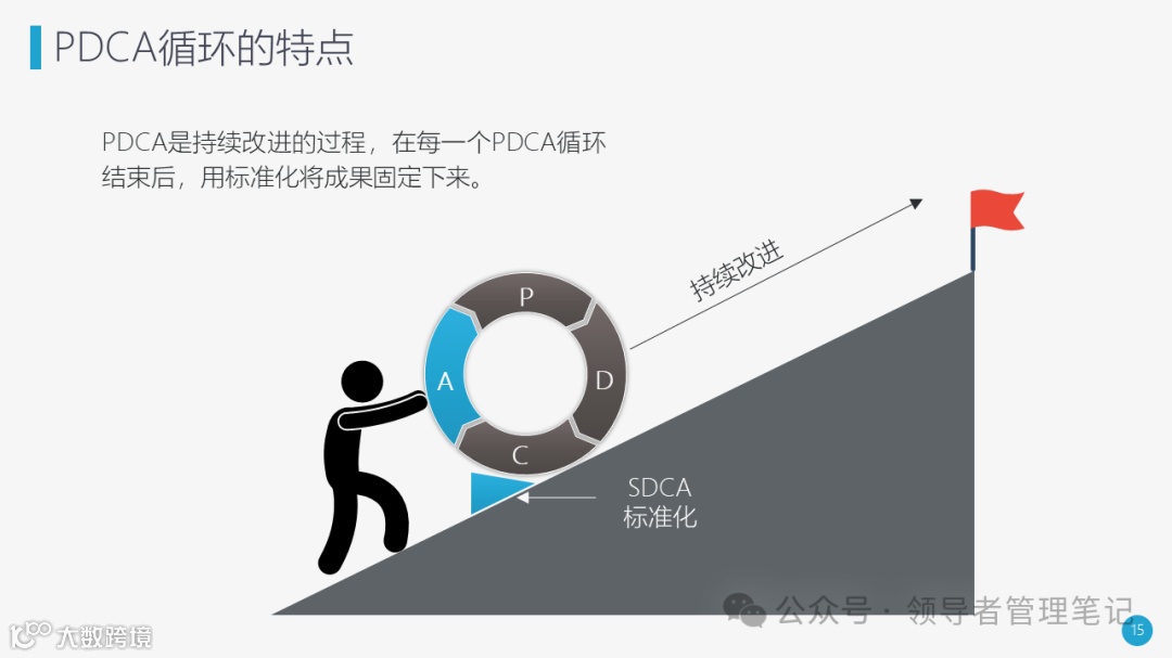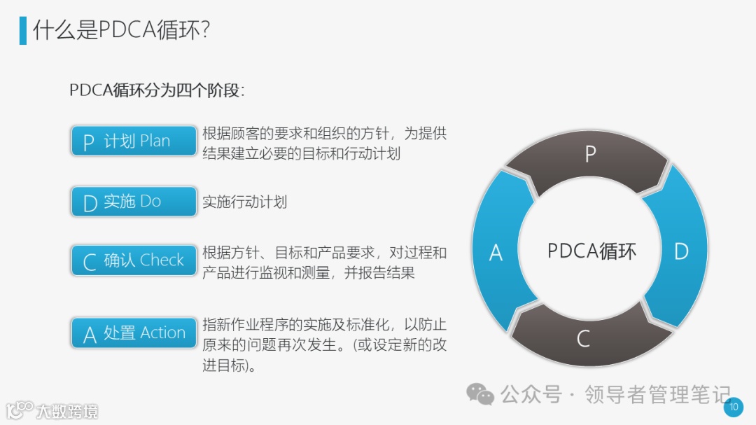 PDCA循环的含义是将管理分为四个阶段,即Plan(计划)、Do(执行)、Check(检查)和 Act(处理)。这一工作方法是企业管理各项工作的一般规律。