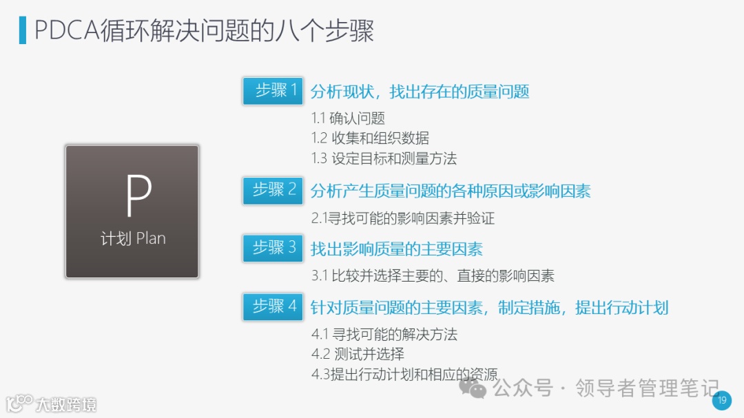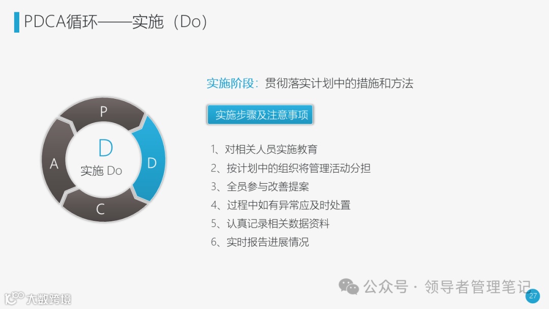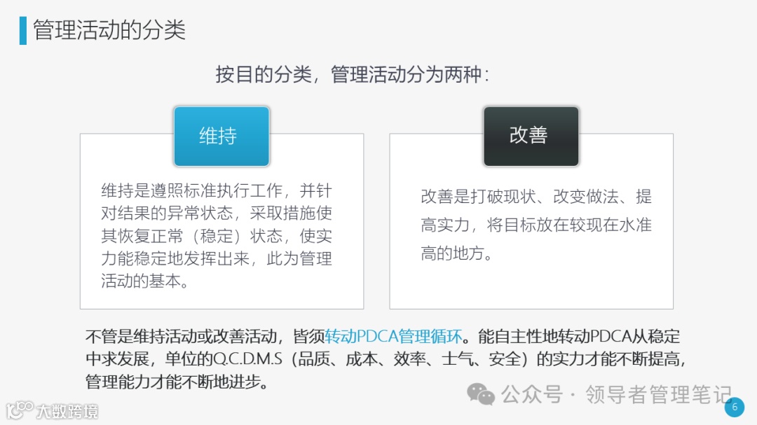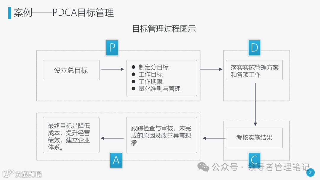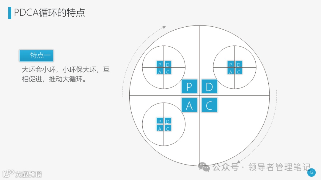 PDCA循环的含义是将管理分为四个阶段,即Plan(计划)、Do(执行)、Check(检查)和 Act(处理)。这一工作方法是企业管理各项工作的一般规律。