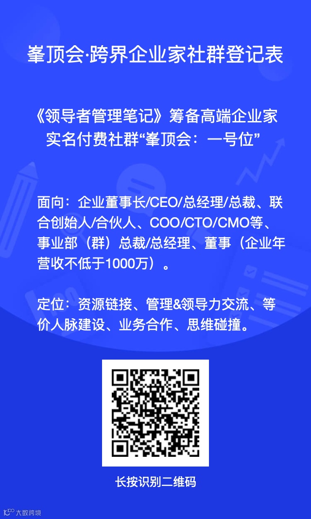 《领导者管理笔记》筹备高端企业家实名付费社群“峯顶会:一号位”。面向:企业董事长/CEO/总经理/总裁、联合创始人/合伙人、COO/CTO/CMO等、事业部(群)总裁/总经理、董事(企业年营收不低于1000万)。定位:资源链接、管理&领导力交流、等价人脉建设、业务合作、思维碰撞。有兴趣加微信:New-leaders ,备注“一号位”。
