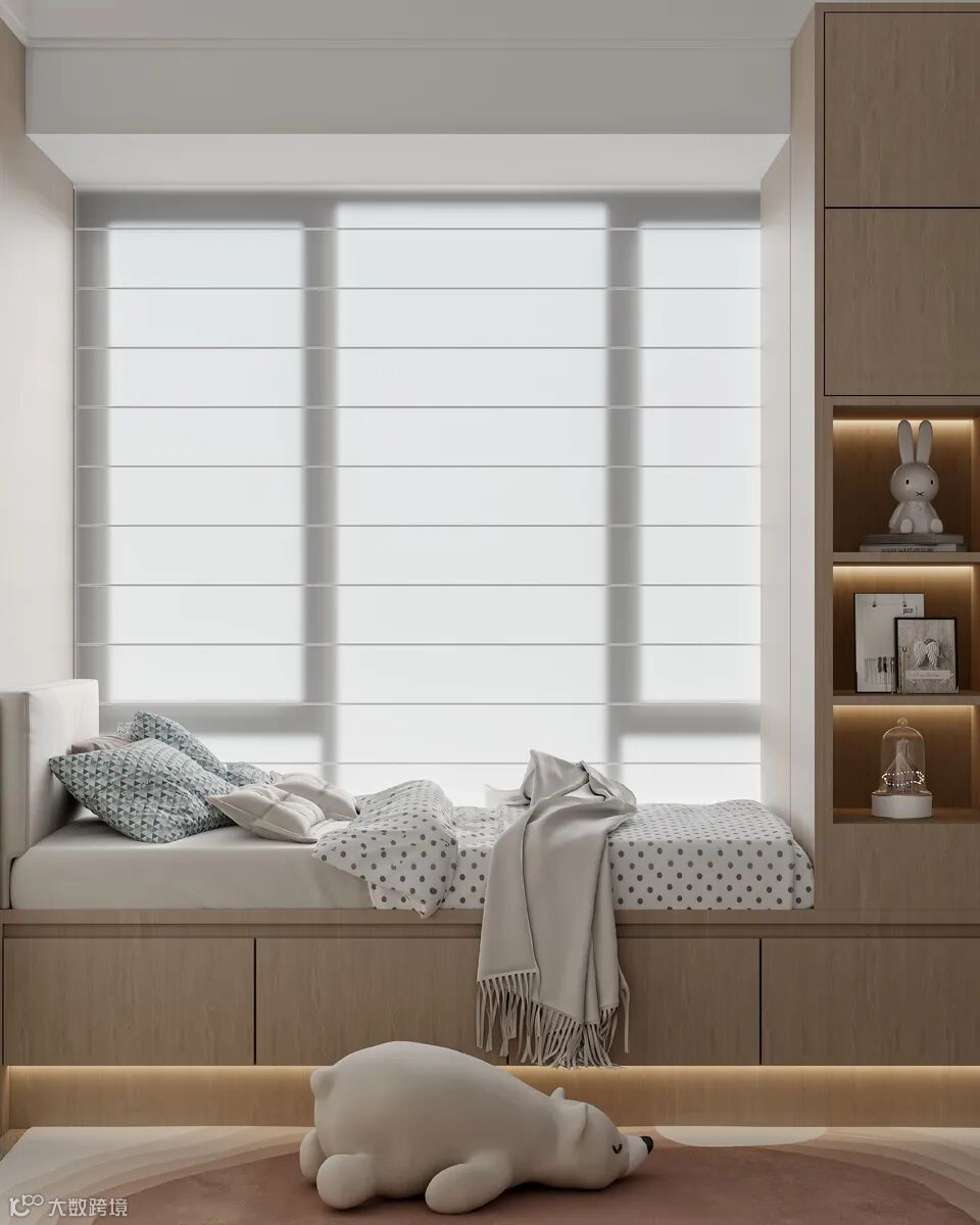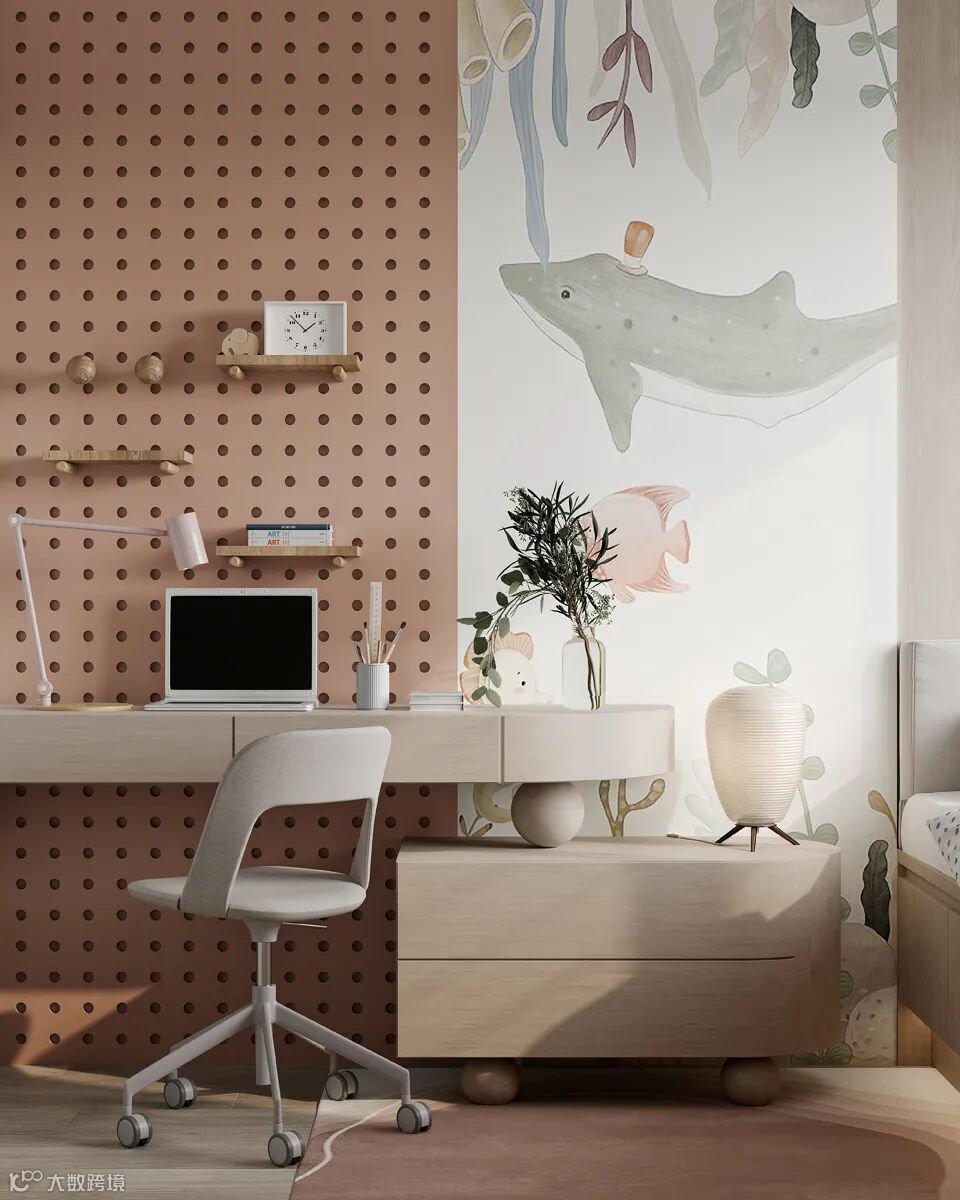 女孩房空间整体以浅色木质作为主调,搭配粉色、米白色进行演绎。形态多样、自然及海洋主题的软装置入给空间带来浪漫、活泼的氛围。