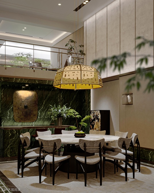 千里逢迎,中式仪仗;宋亭松影,繁盛苍翠。前厅优雅。感性屏风使传统与现代的魅力相得益彰,开合之间,变化空间。户外庭院明净摇曳,清风留声,发出强烈的视觉张力。