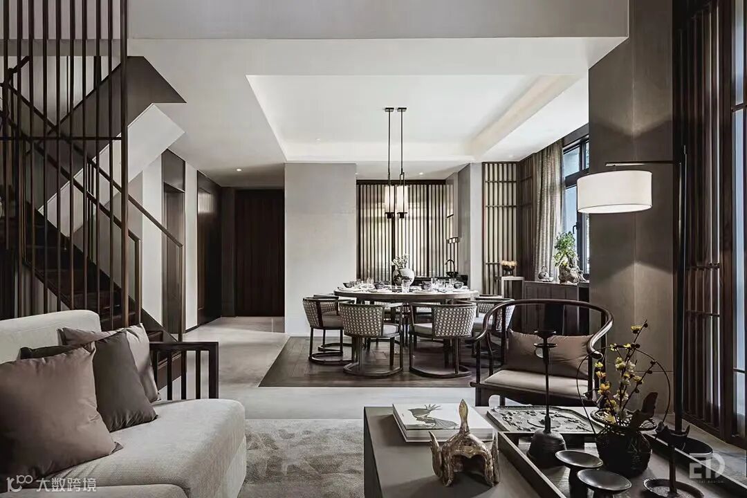 戴勇设计团队以新中式风格为主导,将现代思维与东方美学融会贯通。客厅以东方美学特质彰显待客空间的仪式感。现代水墨画、中式家具经过设计师的现代诠释,融入到现代居所之中。