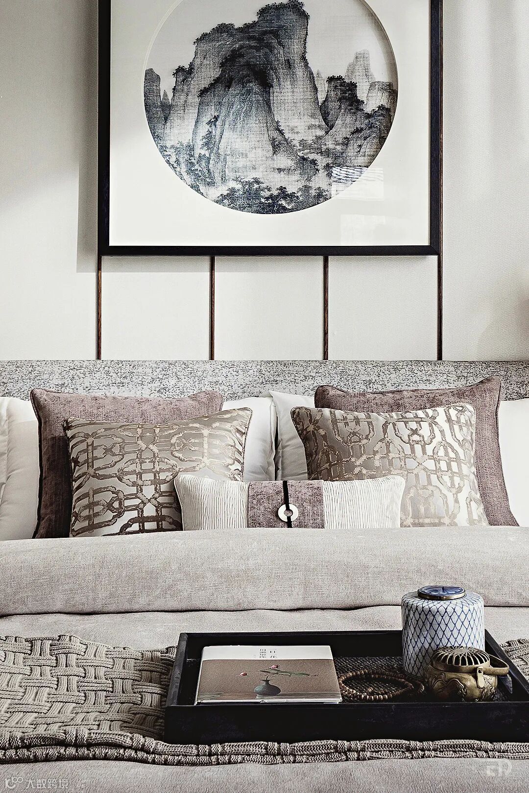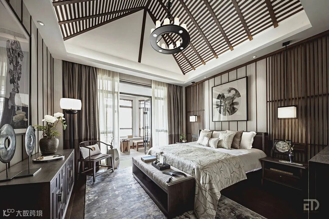 传统宋代山水画、中式纹样及装饰摆件都成为二层次主卧的设计组成元素,共同营造出东方雅致的人文气韵。