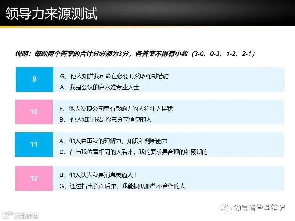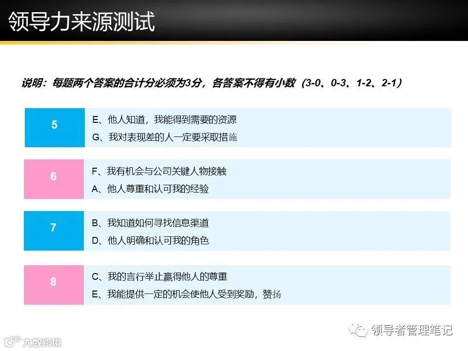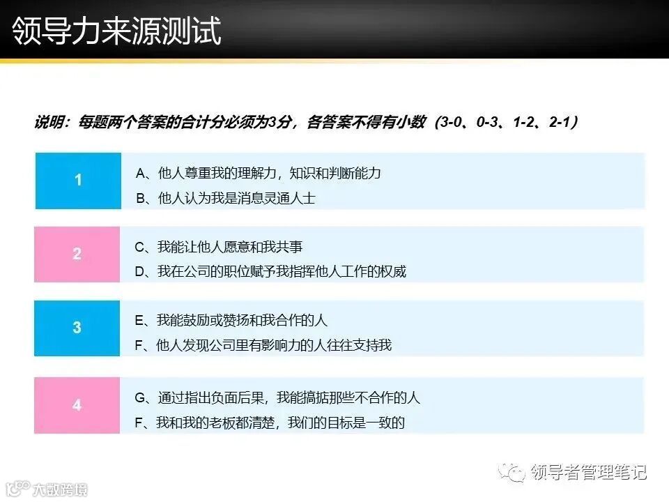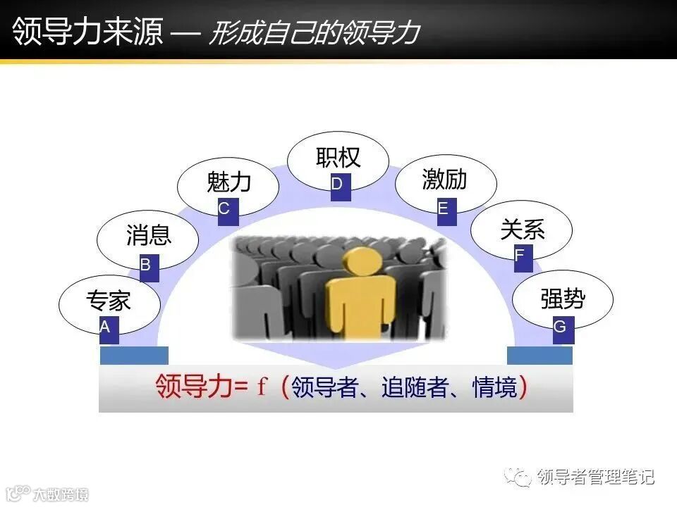来源细分:参考课程中的7大领导力来源(专家、信息、魅力等)。