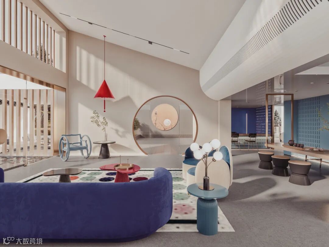 大堂及书吧将红、绿、蓝等颜色的家具及软装放置于浅暖色调的背景中,达到了一种视觉效果上的反差。其色彩时尚且独具个性,使人眼前一亮。优雅风格融合随性的色彩,为大堂休息区营造出独特、活泼而时尚的氛围。通往客房的现代月亮门,是对中国传统园林的致敬,传达了空间的东方意向。