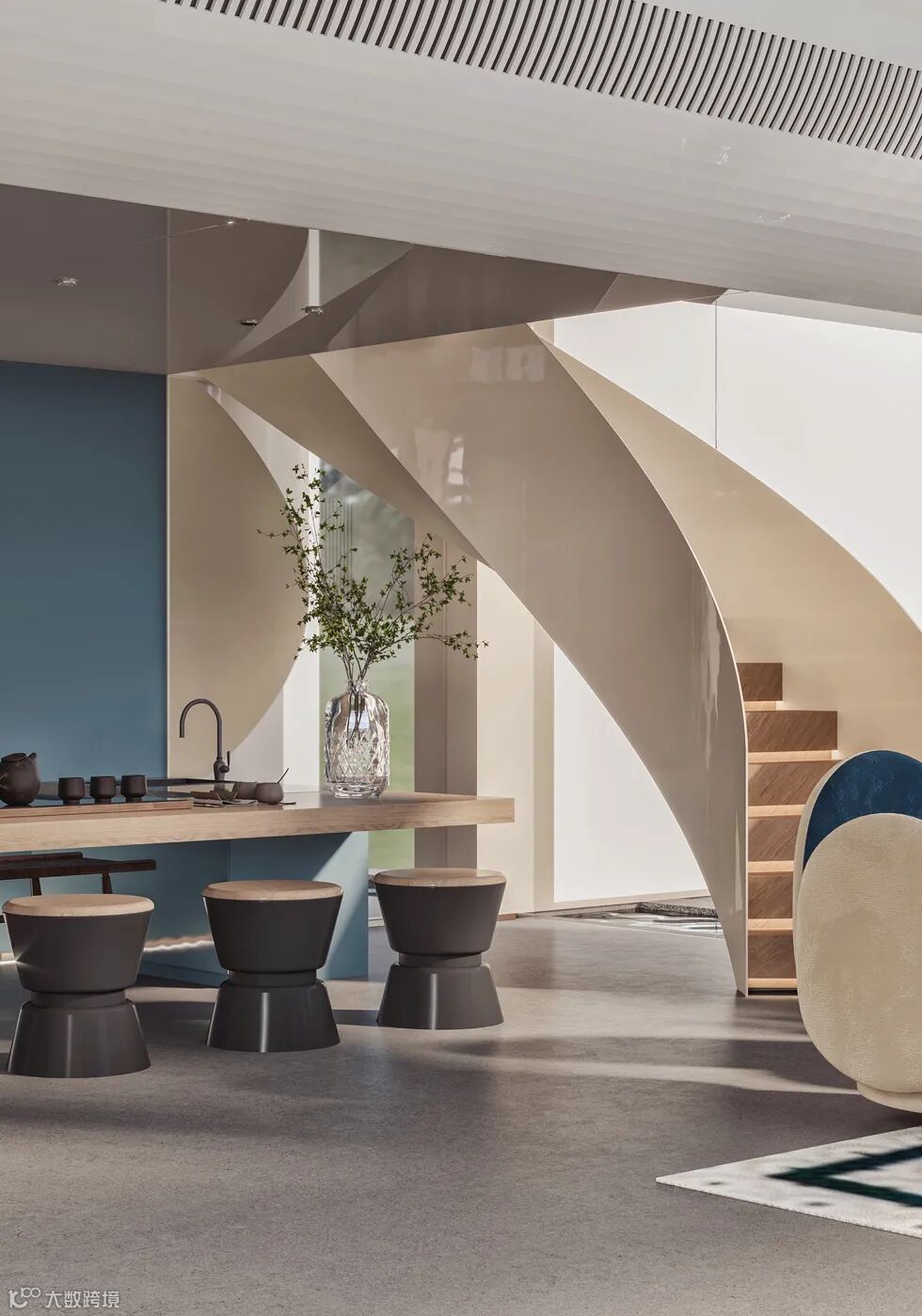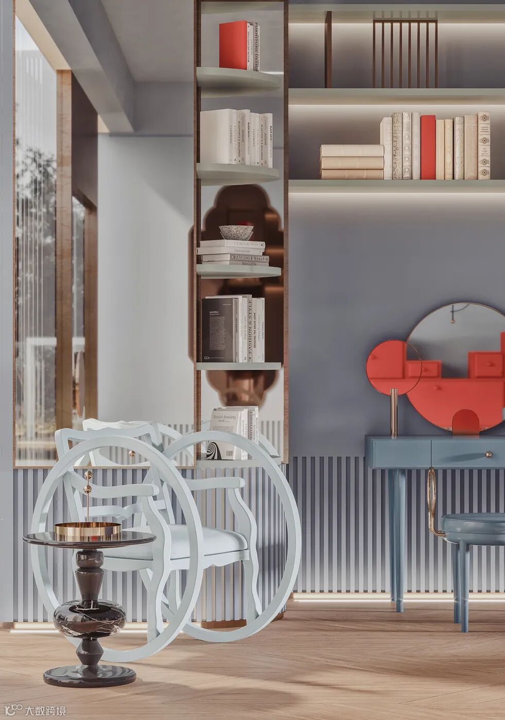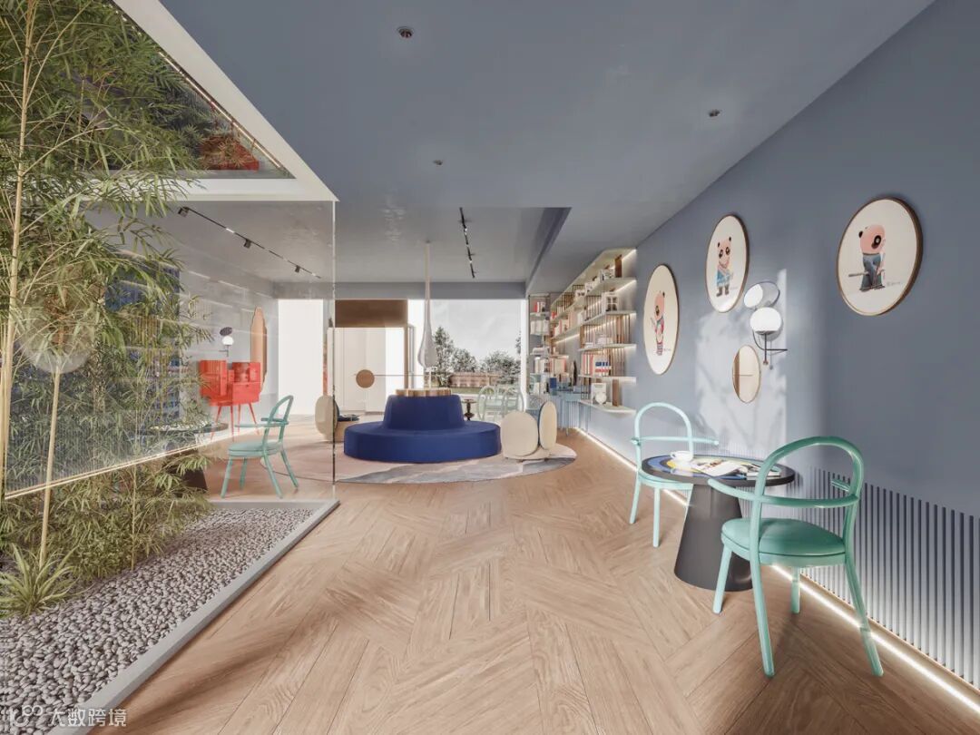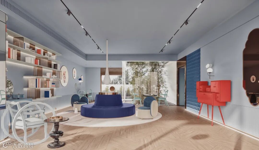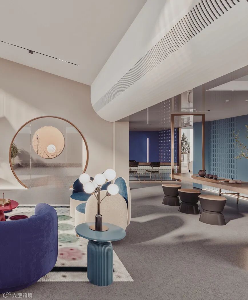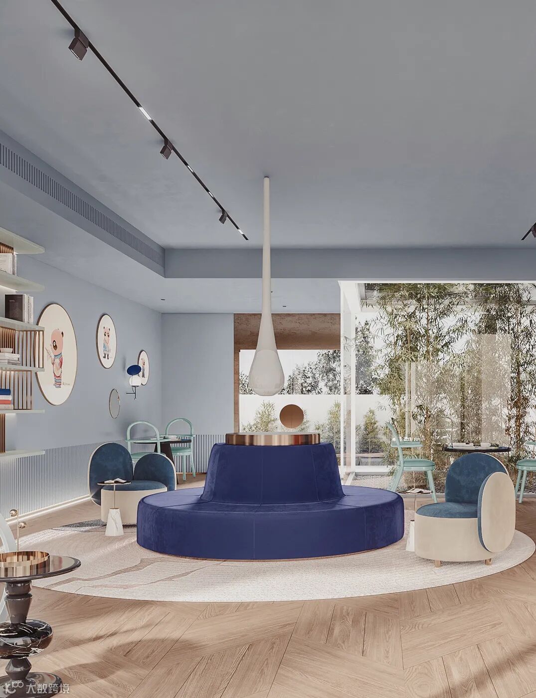 蓝灰色调的墙面营造出大堂书吧宁静的氛围,蓝色的沙发椅和墙面的颜色相呼应。水滴雕塑吊坠在书吧圆形沙发中间,地面铺饰抽象地毯,渲染了书吧的艺术气息。