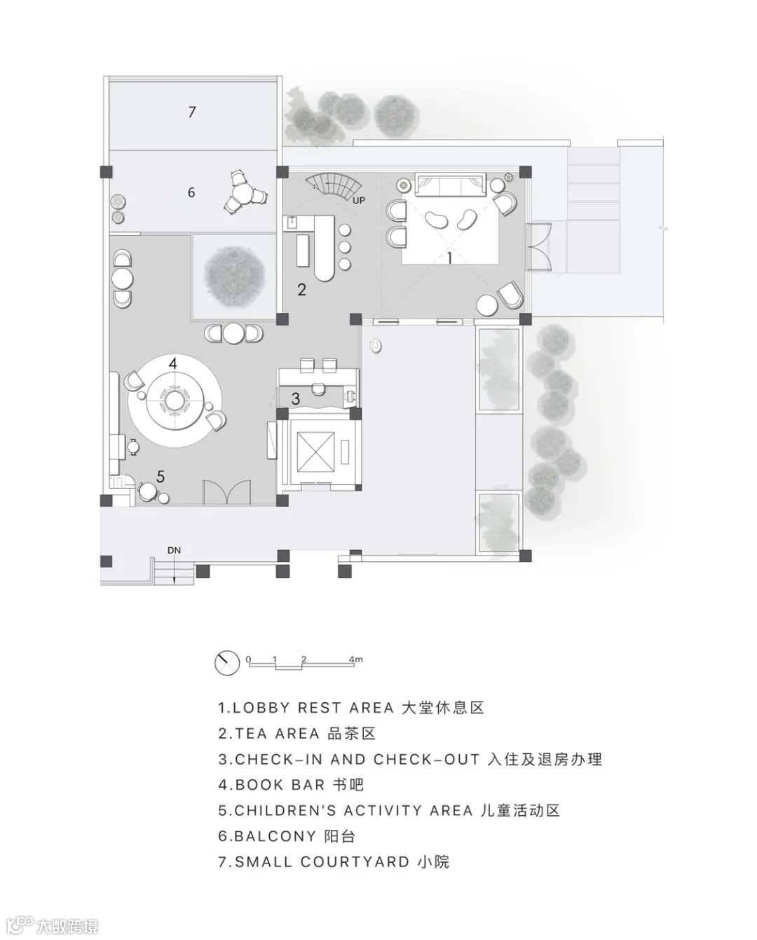 大堂需要搭建出一个隐蔽又便于管理的休息区,设计师通过巧妙地处理,在不影响整体空间效果的前提下,很好地解决了功能需求。并在局部层高较低的位置天花贴了镜面,改善了空间效果。