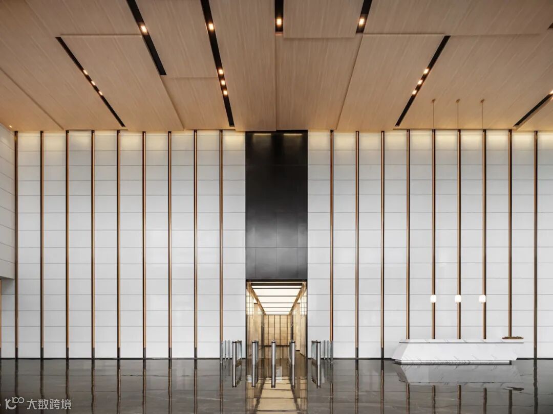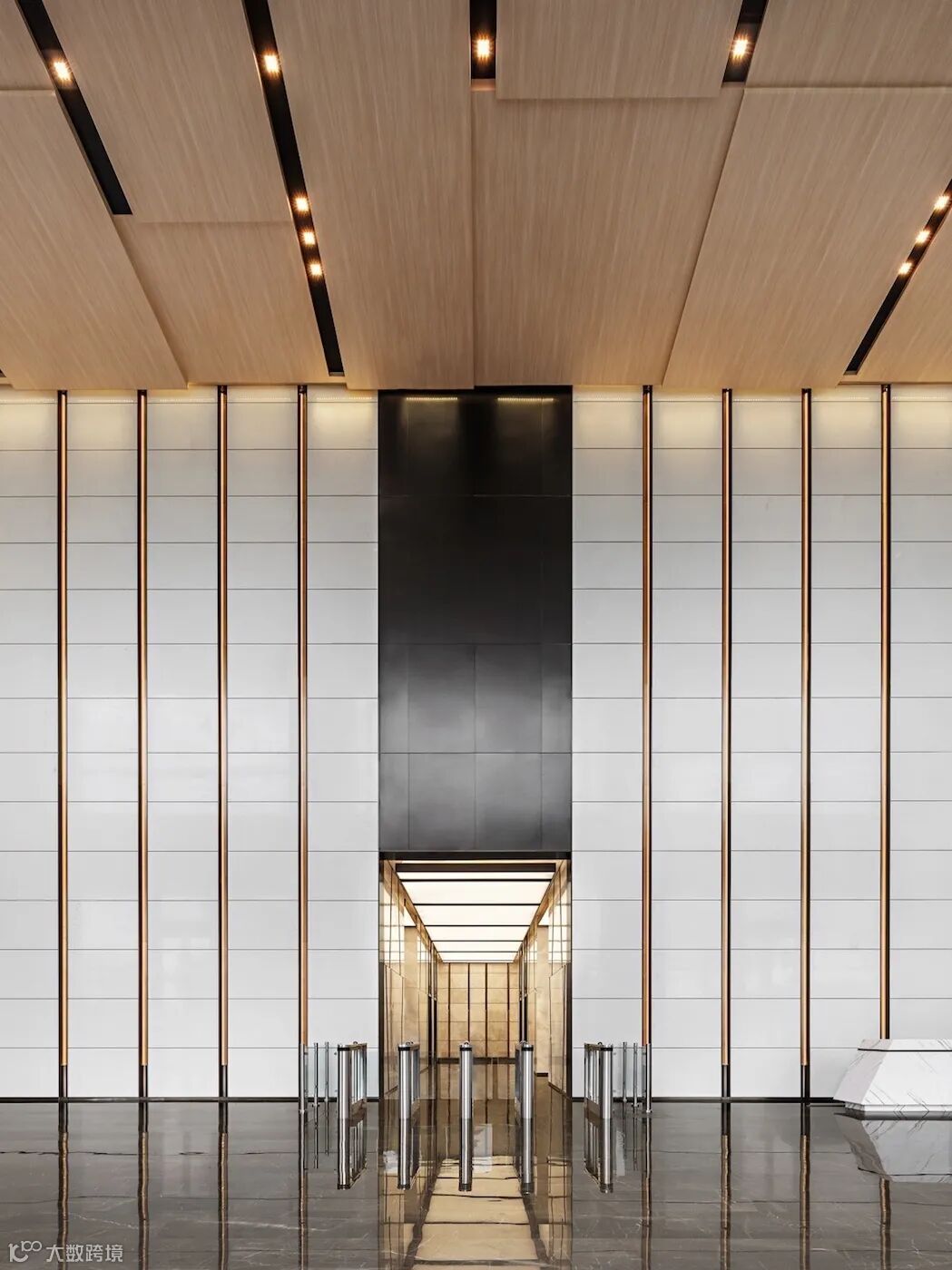 步入12米高的写字楼大堂,浅米色与浅灰色的色彩搭配给人以别样的都会视觉体验。米白色的石材墙面竖向整齐排布,把人的视线引向高处。天花木饰面胶板错落有致,灵动而有序。灰色石材地面给空间增添了沉稳气质。电梯厅的设计在石材的背景上加入了古铜色金属线条的元素,大大丰富了空间的设计感。自动扶梯设置在大堂右侧尽头的位置,合理引导了交通流线。