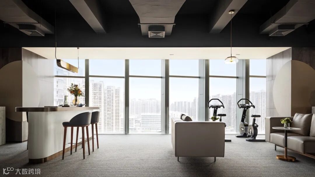 配备的视频大会议室为沟通汇报提供了良好的空间。灵活开放的休息区域,亦可作为会客、洽谈的场所。休息区设置了吧台和健身器材,这些休闲设施紧靠办公区域,既可以健身、会客,又节约了不少时间。员工通过短暂的放松,可以更好地投入工作。这一设计从使用者的角度出发进行规划,体现出人性化办公的设计理念。