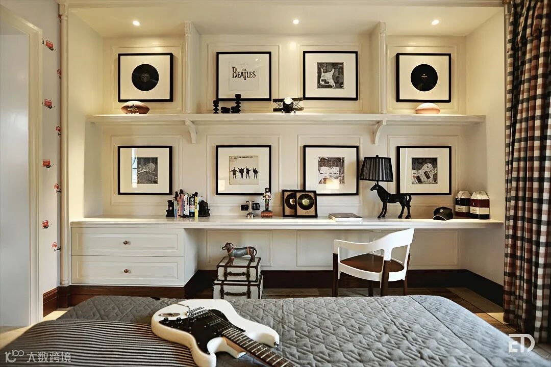 二层家庭厅,天花同样是木梁装饰,乳白色的木墙板营造出温馨的家庭气氛,墙上挂着复古的壁毯和古老的地图,装饰柜里陈列着主人收藏的装饰摆件,复古优雅的氛围弥漫在整个空间里。