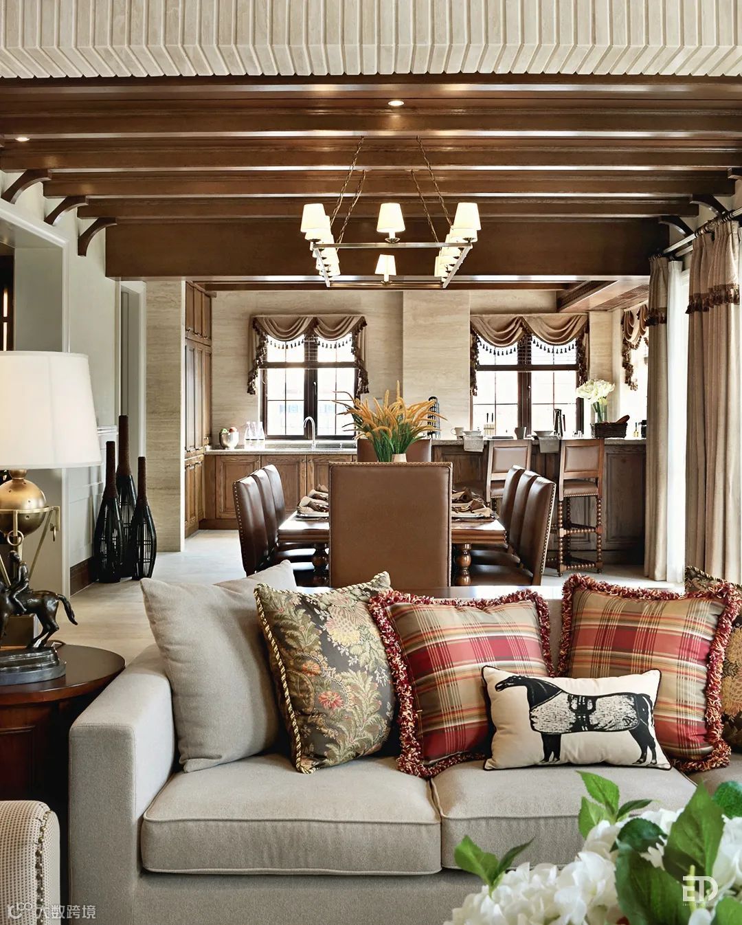 一层客餐厅天花用木结构梁装饰,营造乡村木屋的感受,铁艺吊灯、石头壁炉及古典的家具,令人滋生出怀旧情绪。