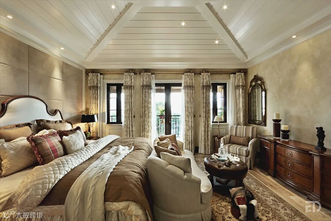 三层主卧室乳白色木板装饰的坡顶造型天花、绒布的硬包背景、斑驳的墙纸和经典的家具等,营造都市中难得的休闲氛围。一杯红酒、一首爵士乐,在这种气氛中是最合适不过的了。