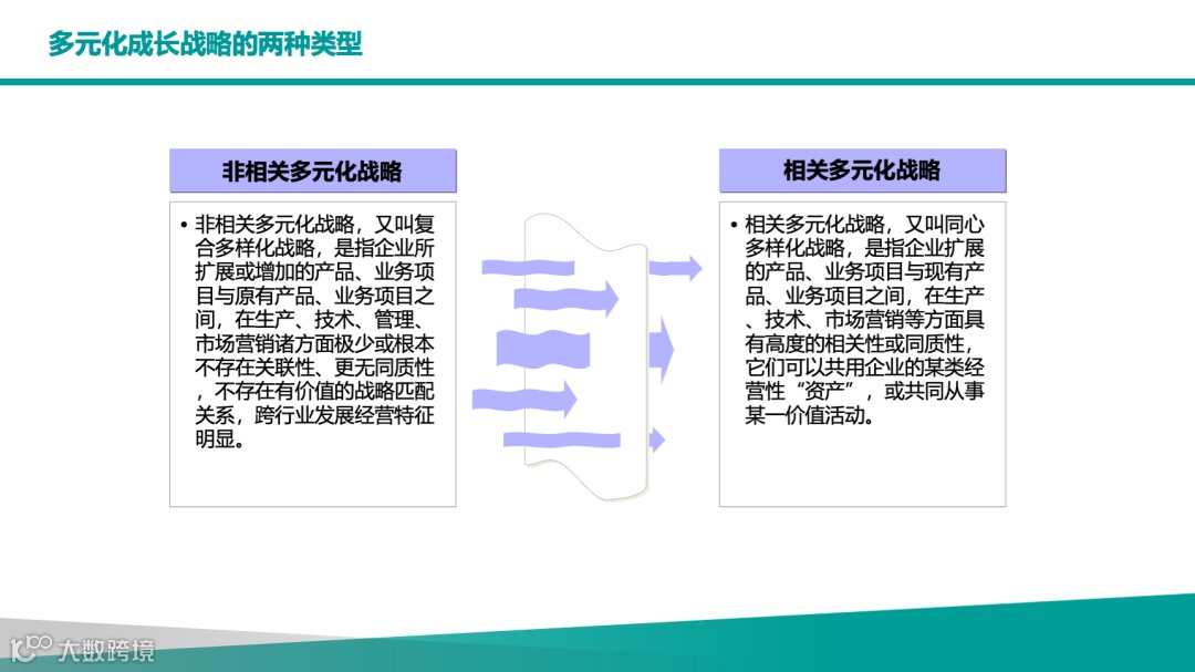 维度 高相关 中相关 低相关 技术关联 佳能从相机到打印机(光学技术共用) 美的从家电到机器人(电机技术延伸) 恒大从地产到矿泉水(无技术关联) 渠道关联 联合利华洗发水与沐浴露同渠道销售 小米手机与充电宝共享线下门店 亚马逊从电商到AWS(渠道独立)