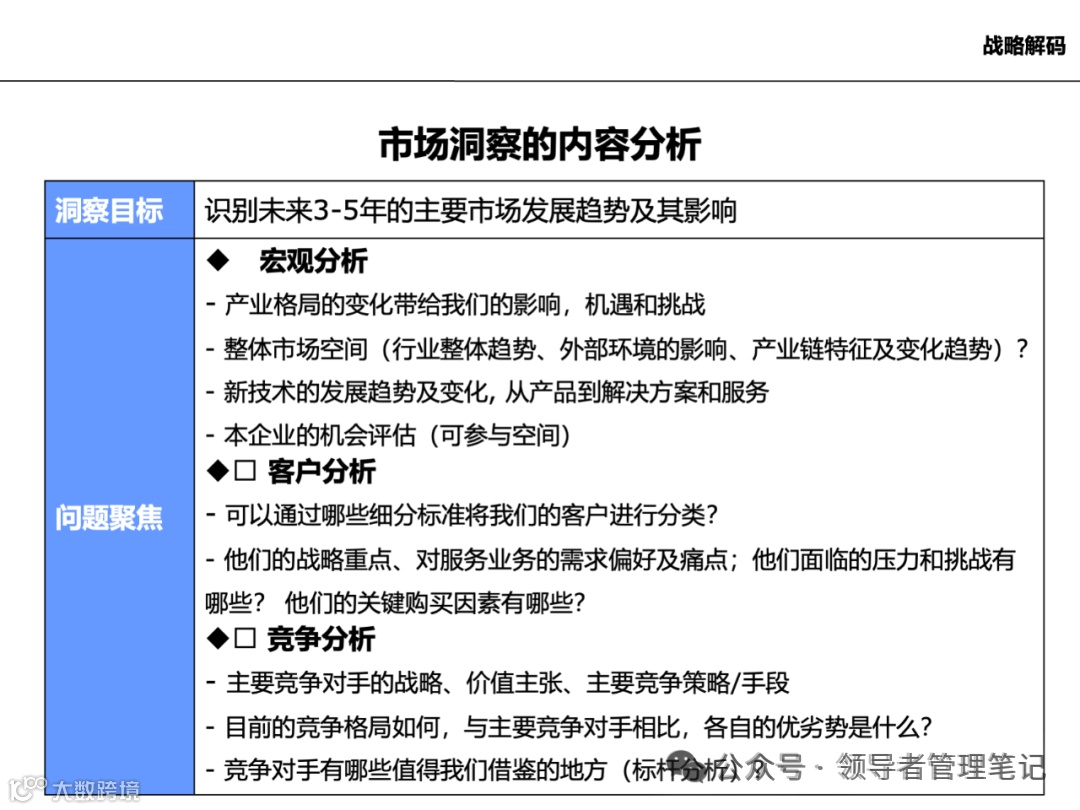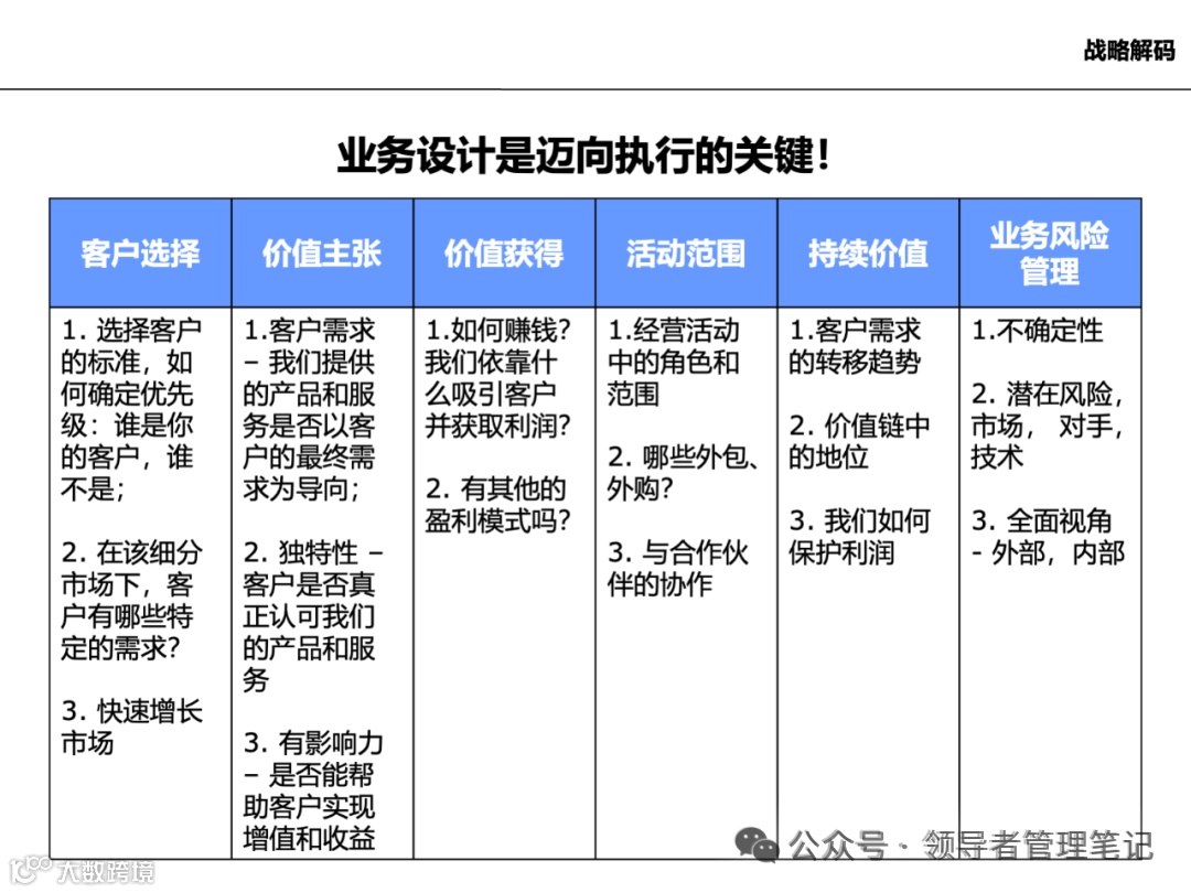 认知统一:通过战略澄清图(如BLM业务设计六要素)对齐组织心智,解决高管每月战略讨论不足1小时的"战略失焦"问题; -