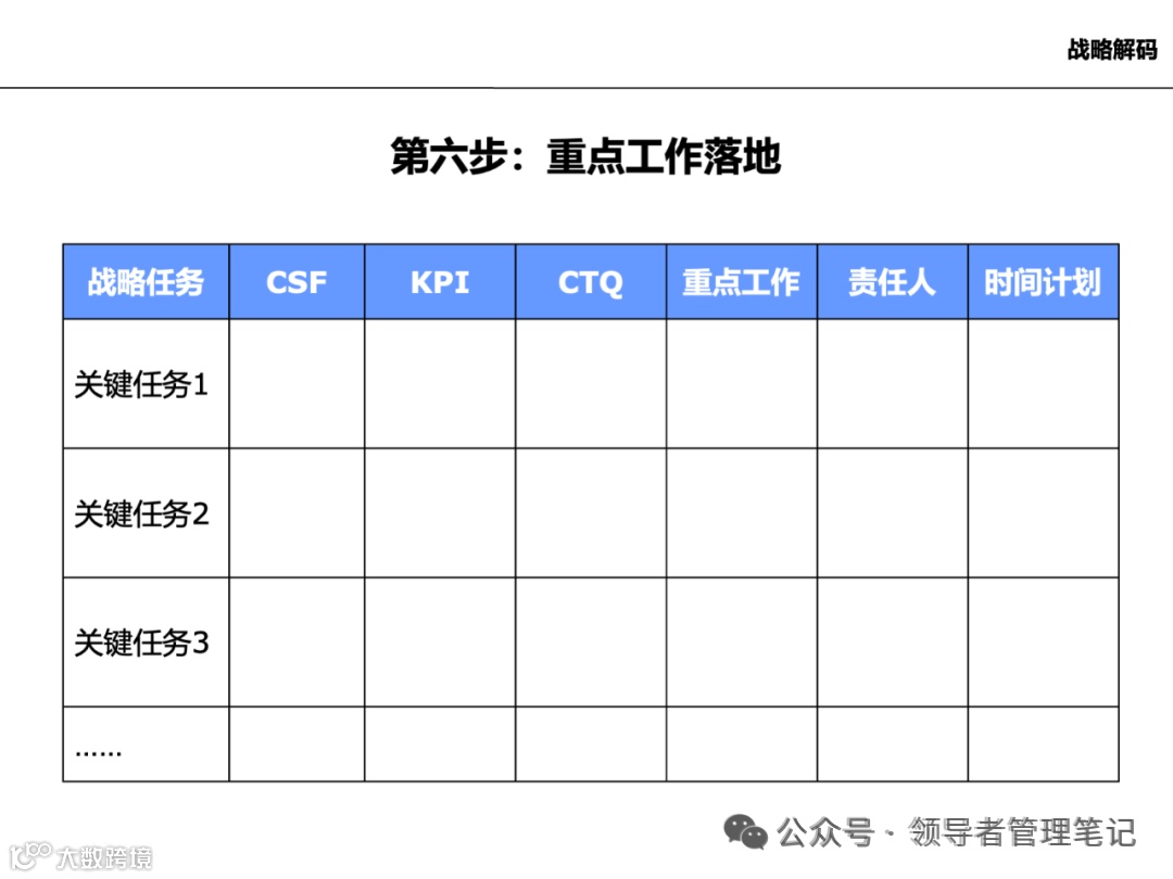战略解码的本质是构建"战略-执行-结果"的闭环管理系统。其核心逻辑体现在三个关键转化: