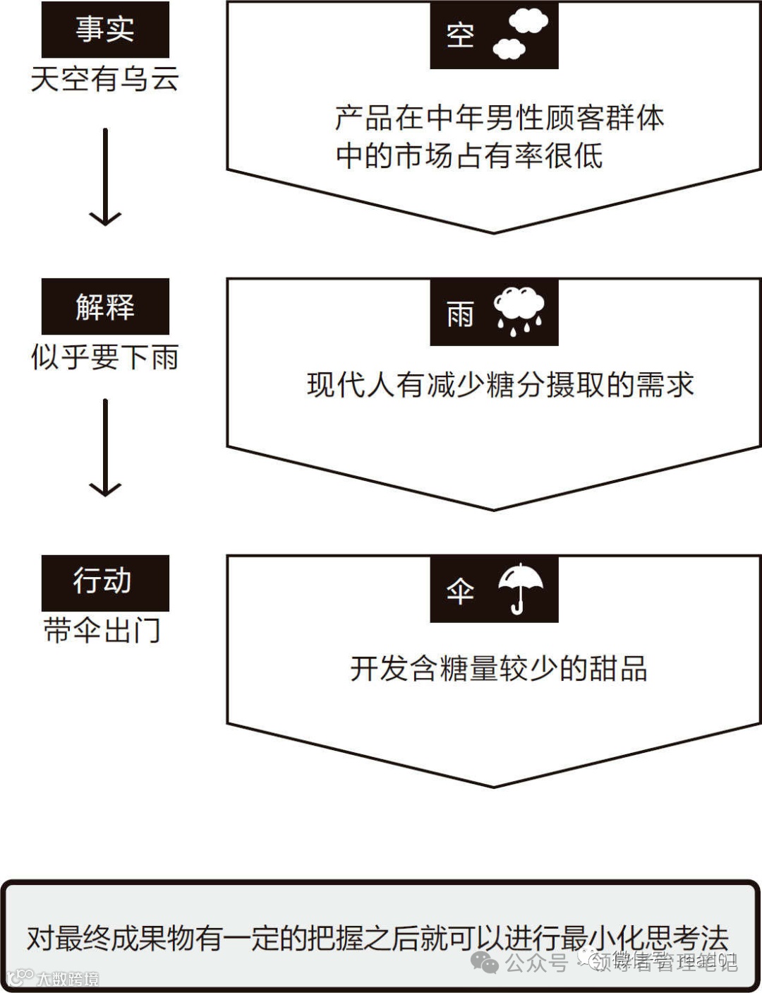 思考要有“边框”。所谓框架,就是思考的边框。“空”(事实)→“雨”(解释)→“伞”(行动)就是一种框架。