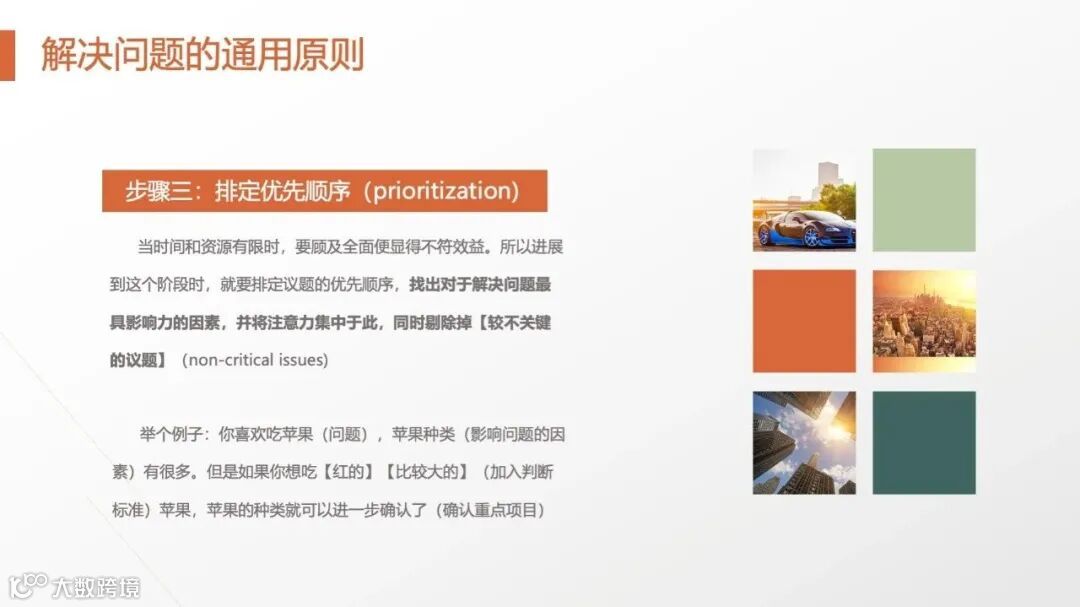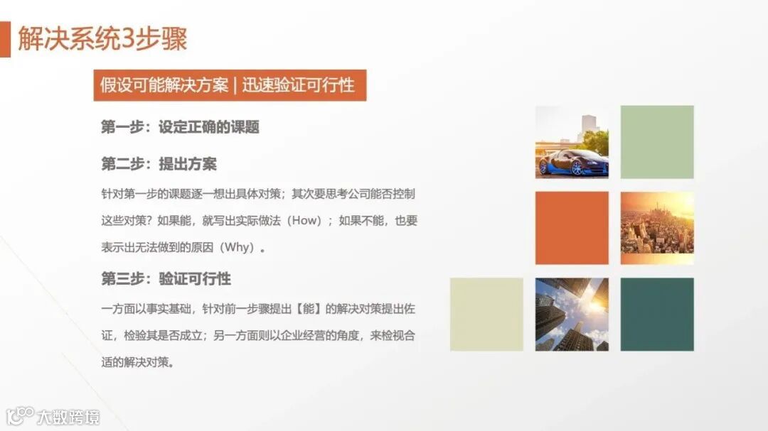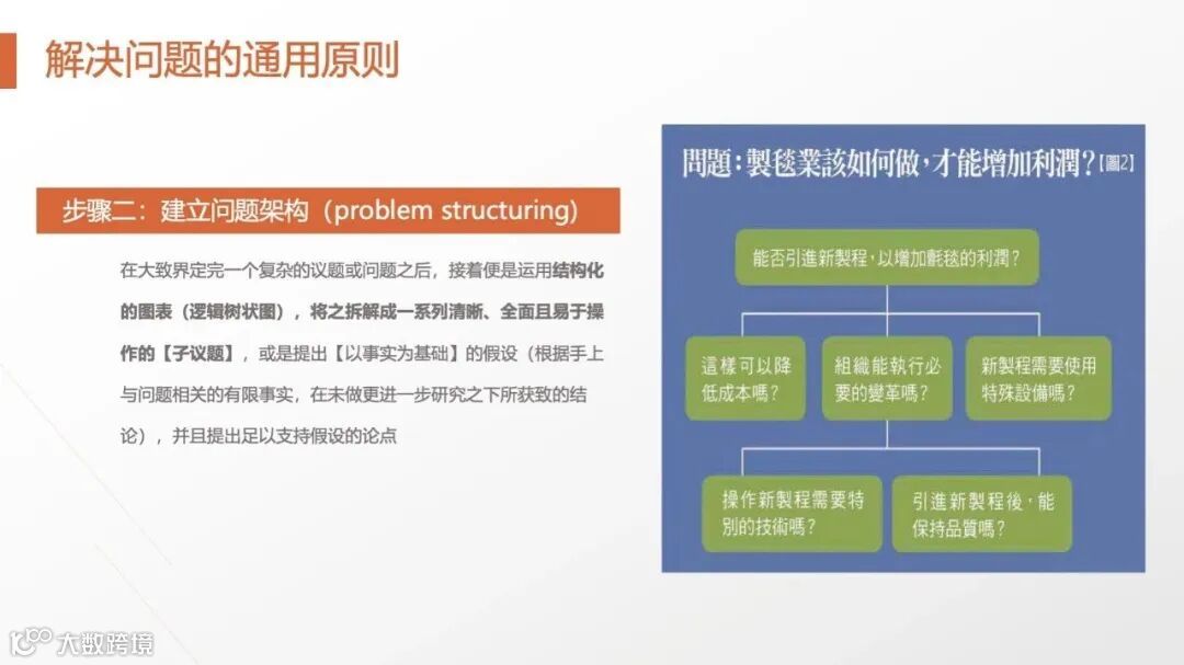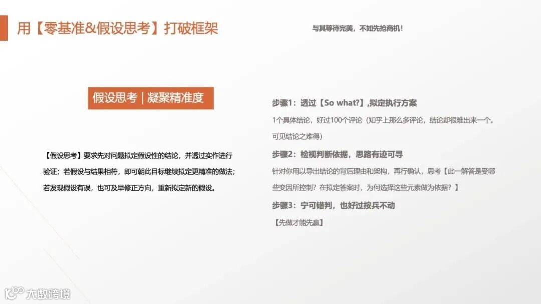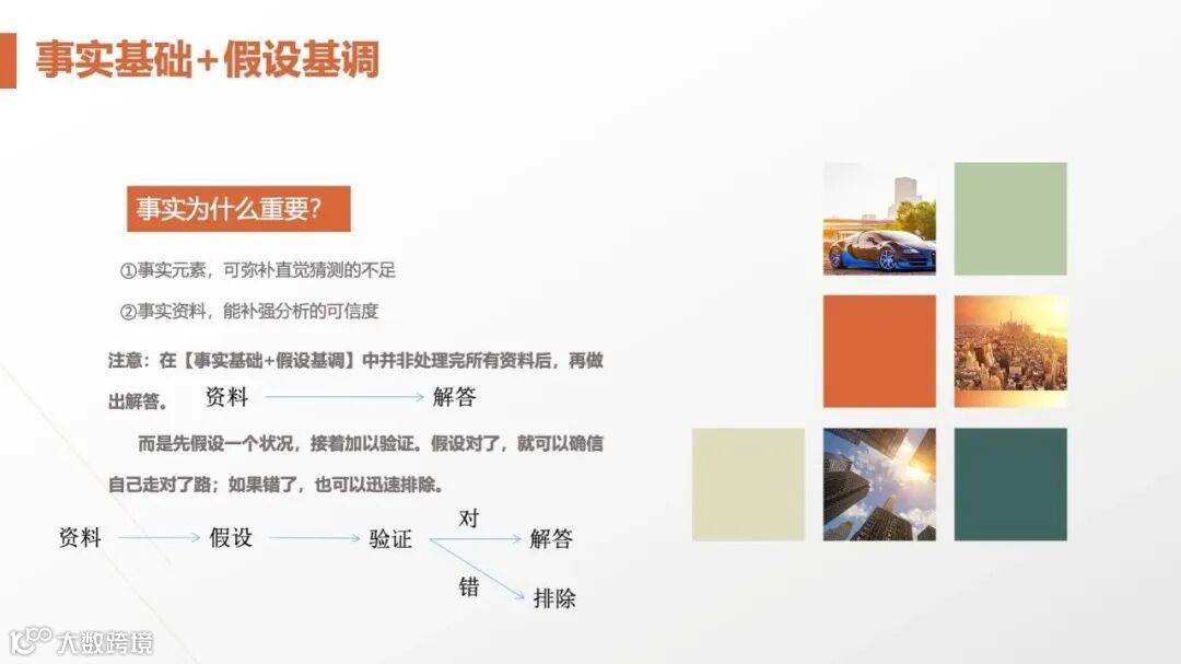 麦肯锡强调“先假设,后验证”:基于有限事实快速提出假设(如“某产品滞销因价格过高”),再通过数据调研、用户访谈等方式验证。