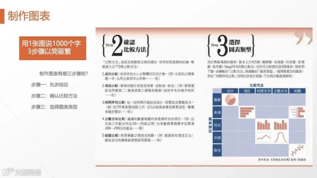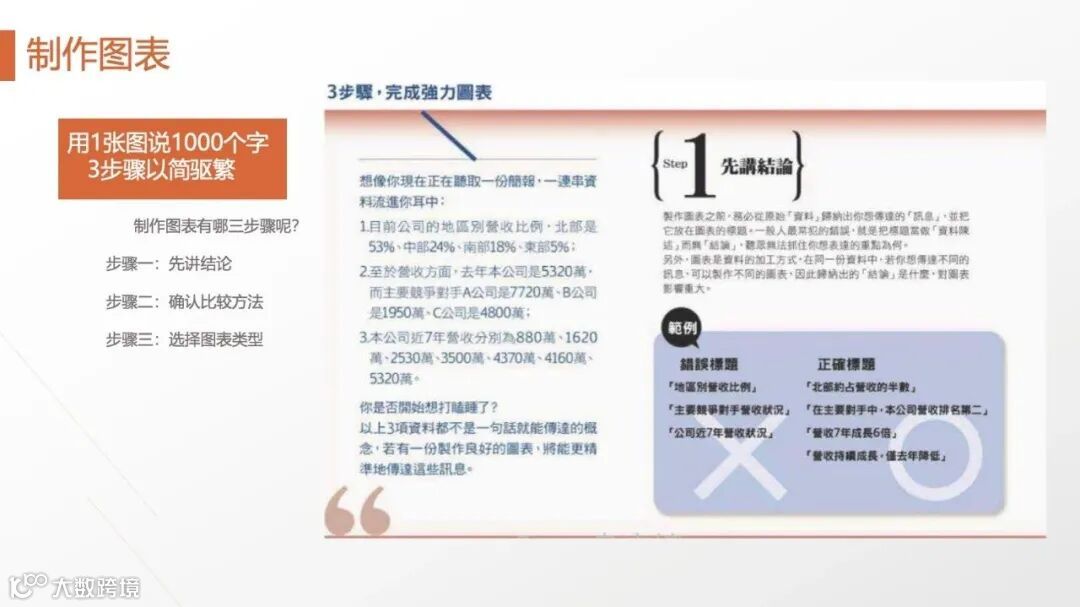 • 简报技巧:遵循“图文比9:1”,图表标题必须是结论(如“错误标题:地区营收比例;正确标题:北部市场贡献53%营收”),字体大小确保“32倍距离可见”,让听众快速抓住重点。