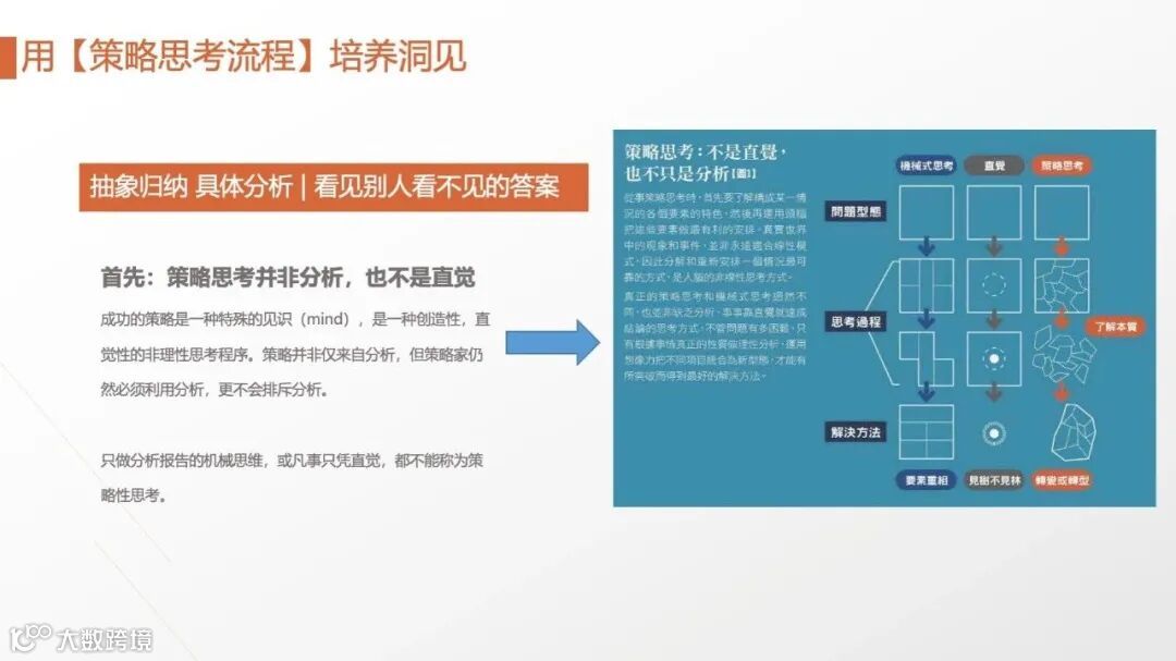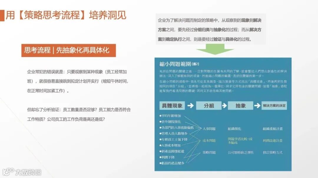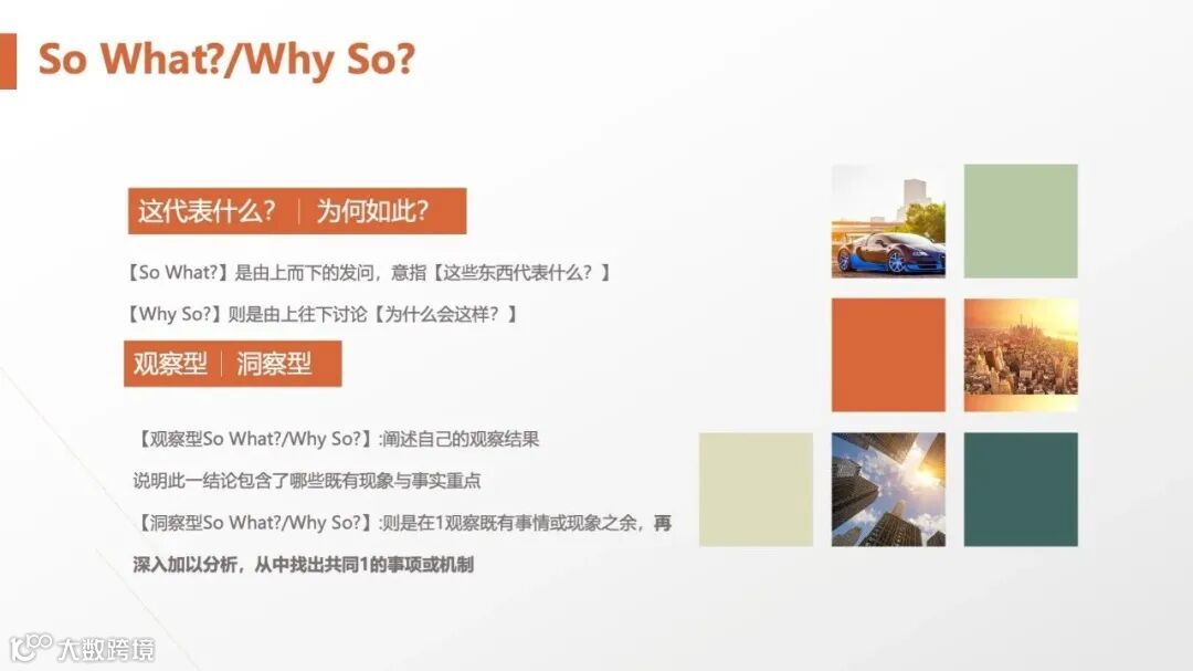 • Why So?(为何如此):由下而上验证逻辑,从结论倒推原因(如“忠诚度危机”→“竞品促销力度加大”“售后服务响应延迟”)。 二者结合形成“观察-分析-洞察”的闭环。